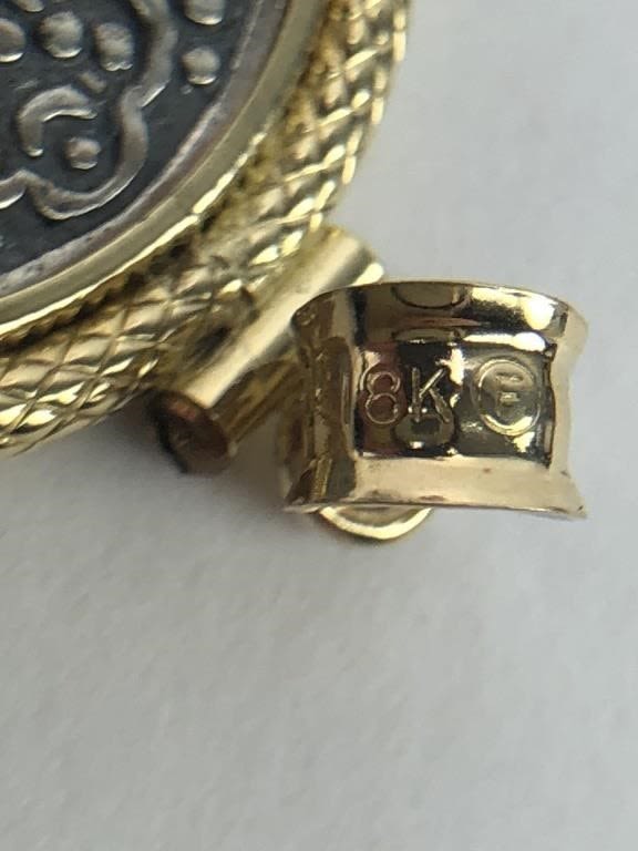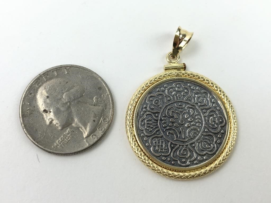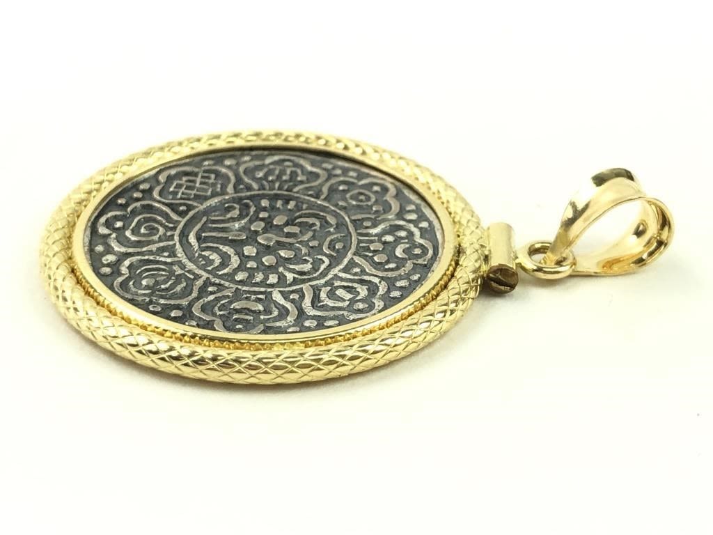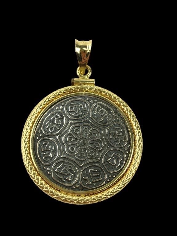 Tibetan Tangka Coin framed in 18K Gold. Marked “18K” & F in a circle. Total weight 7.05 grams.