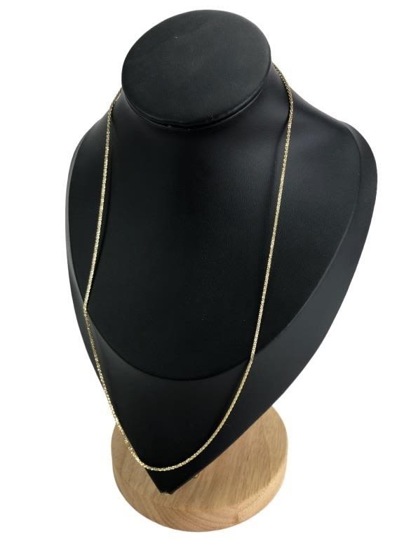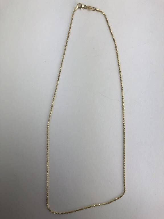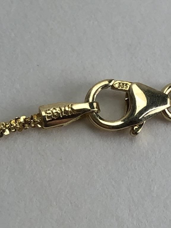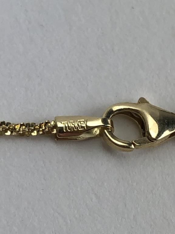 Marked “14K EG TURKEY”. Measures appox 20″ L with clasp. 3.34 grams.
