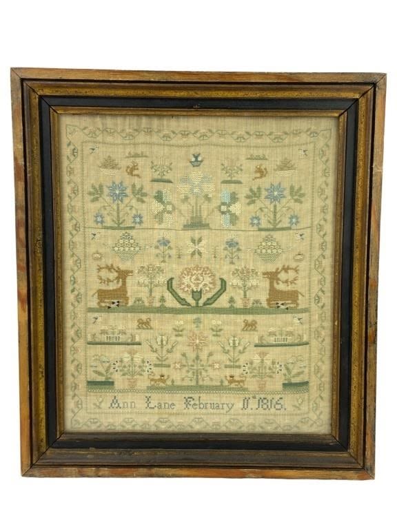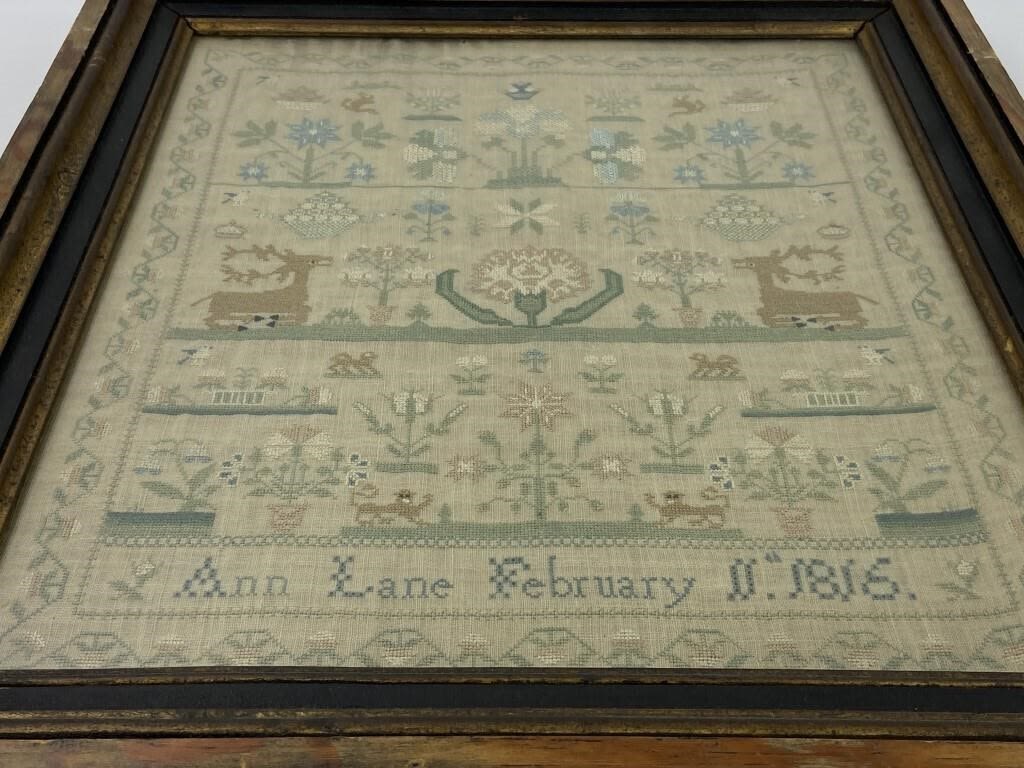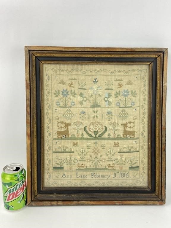 Frame measures 16 x 18″. Sampler includes deer, flowers, birds & other plants and animals. By “Ann Lane February 1816”