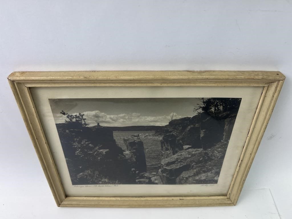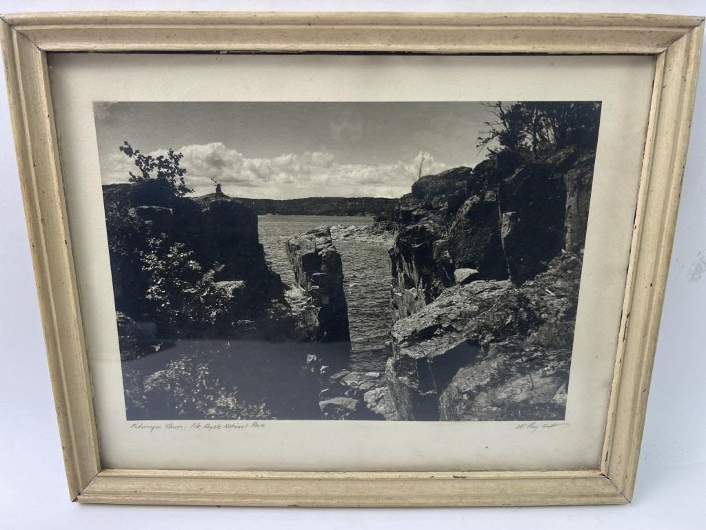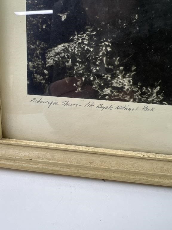 Frame is 15″ x 12 Inches. Pencil signed. “Picturesque Shores – Isle Royal National Park”. Frame shows signs of wear.