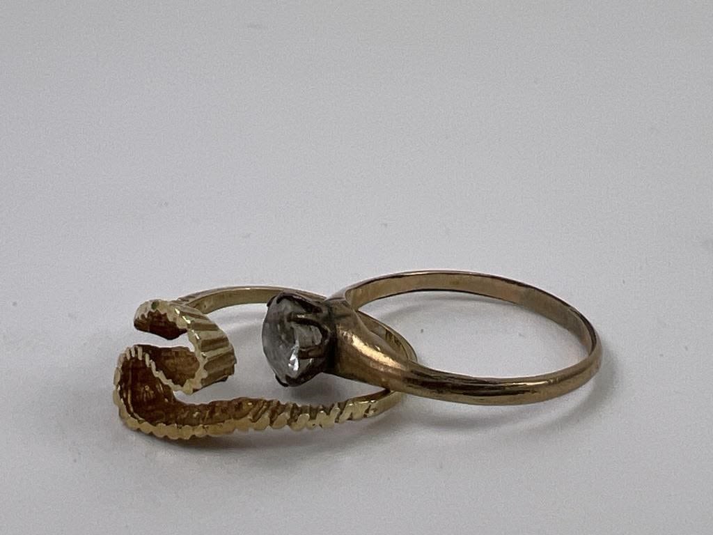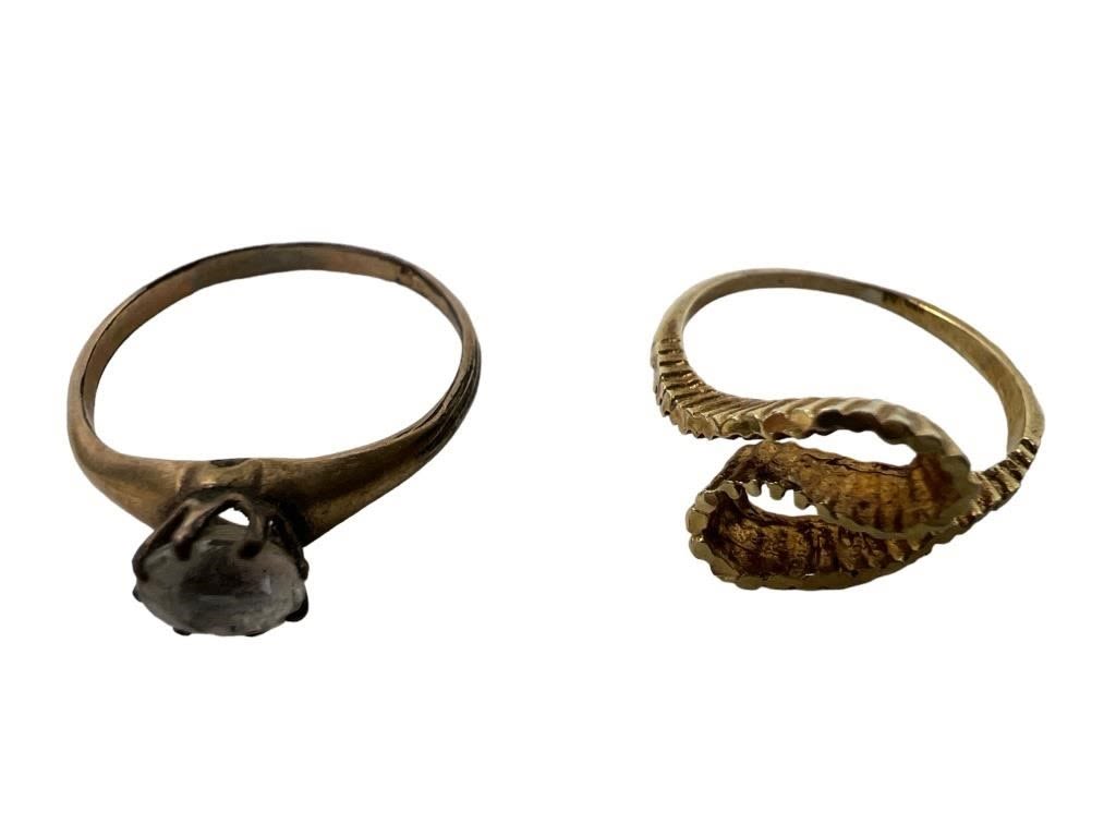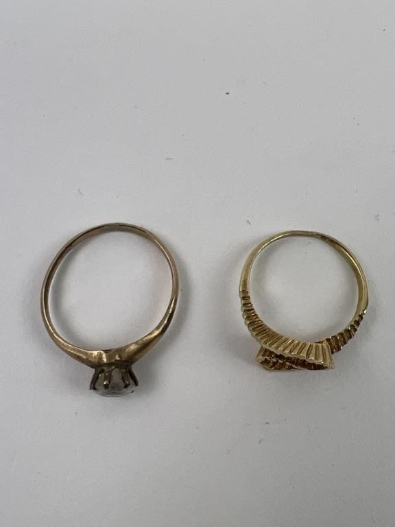 Both tested as 14k but not marked. Ring with the stone is size 5 1/2. Second ring is size 2 1/2. Smaller ring 1.32 grams. Ring with stone 1.14 grams. 2.46 grams total for both rings.