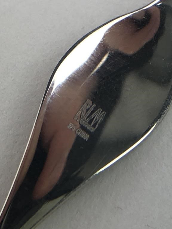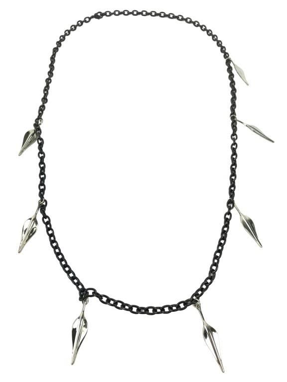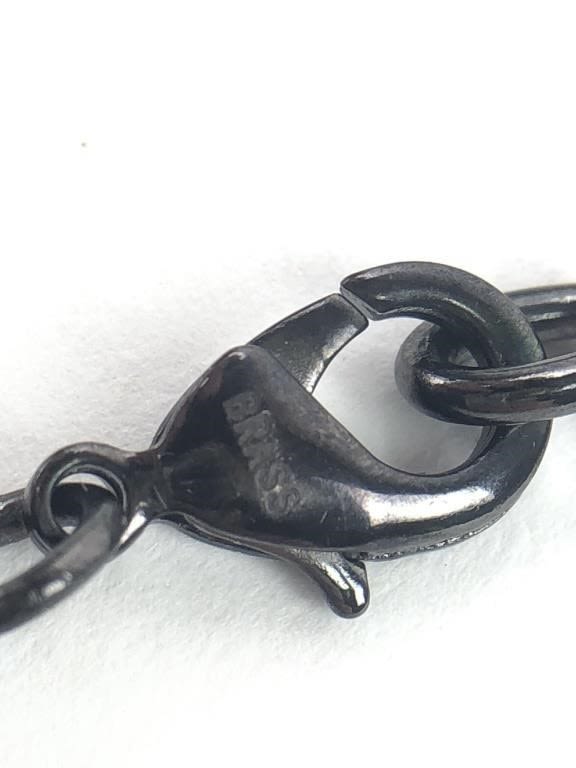 Black tone brass chain necklace (marked BRASS on clasp) with Sterling Silver leaf style pendants. (Marked RLM Studios 925 China on one of the pendants. 35″L..