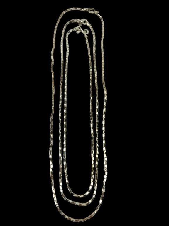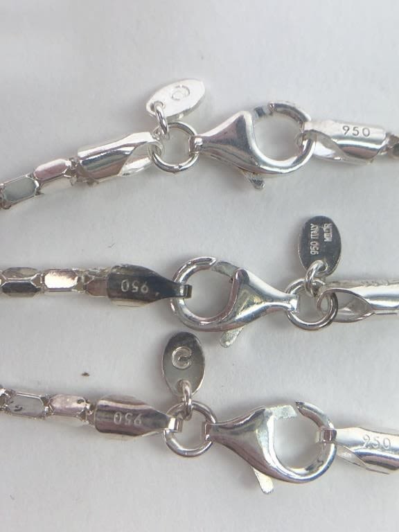 All marked 950 Italy MILOR. Some black marks on the clasp of the longest necklace, perhaps from a previous testing. 24″, 20″ & 18″. 27.7 total grams.