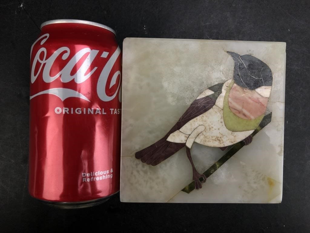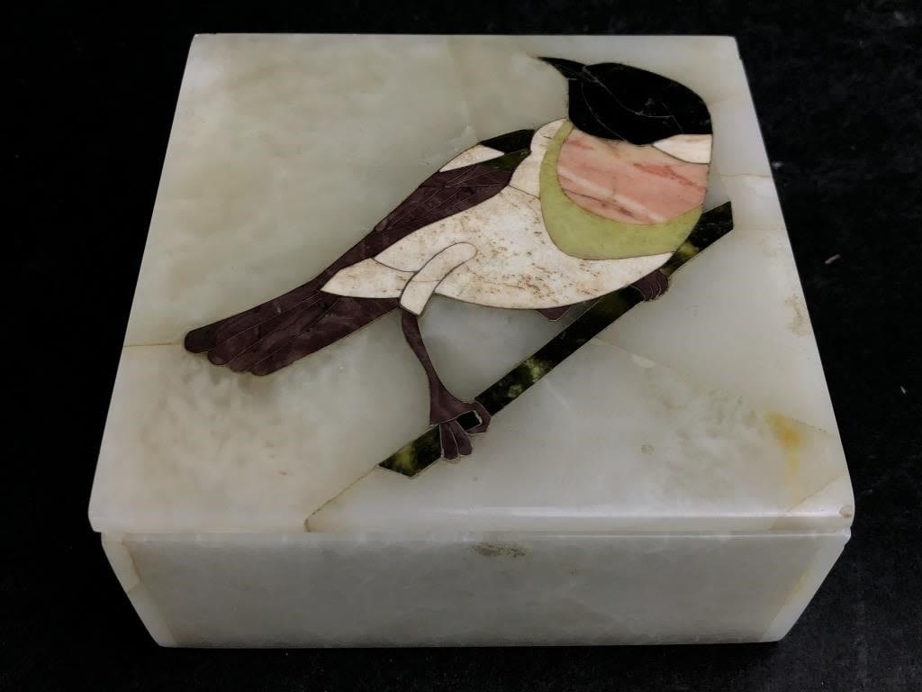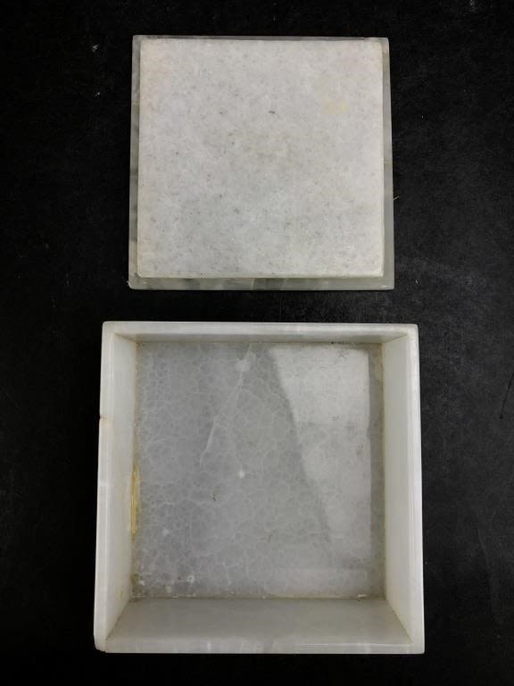 Lidded Marble Trinket Box. 2″Tx4.5″Wx4.5″D Cracks and glue residue visible.