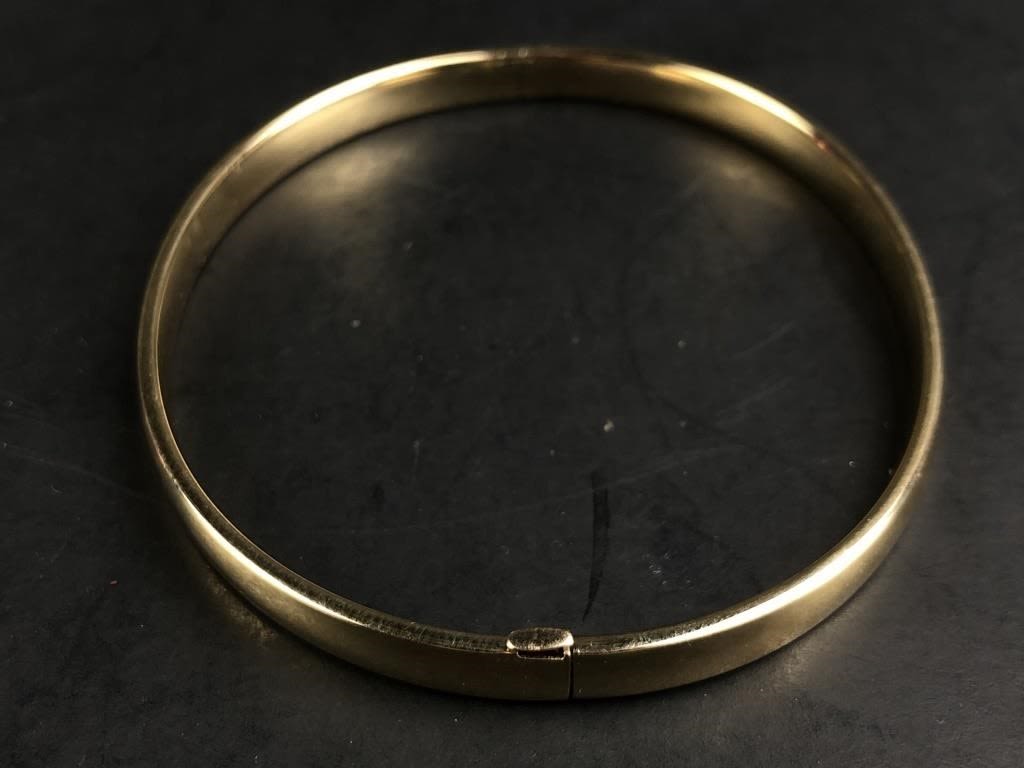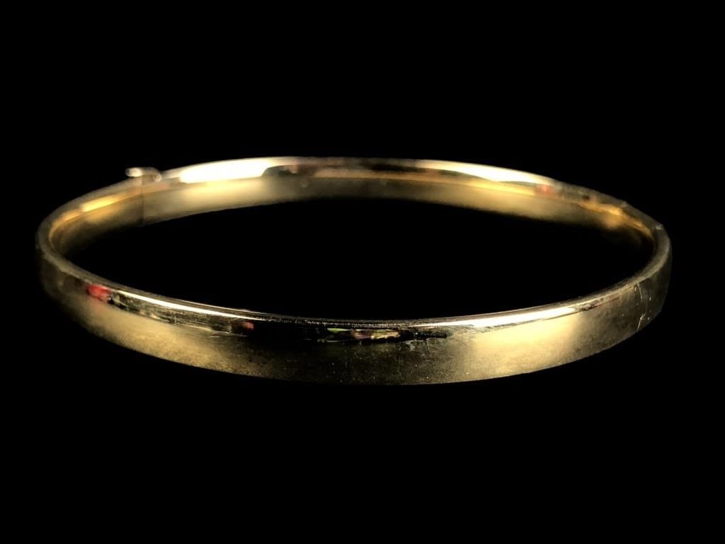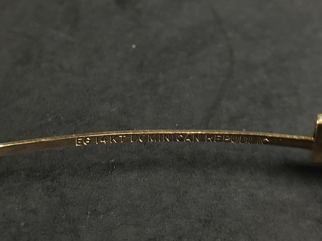 Marked “EG 14K DOMINICAN REPUBLIC”. 2 5/8″ x 2 3/8″ interior diameter. 2 7/8″ x 2 5/8″ exterior diameter. 9.07 grams.