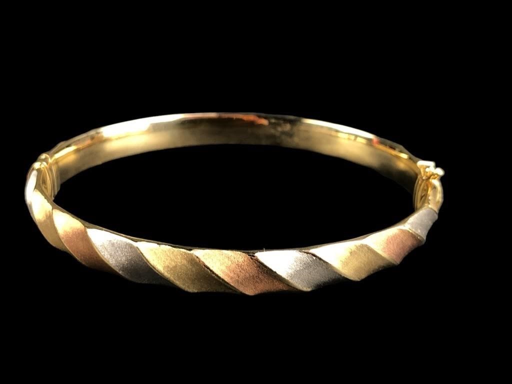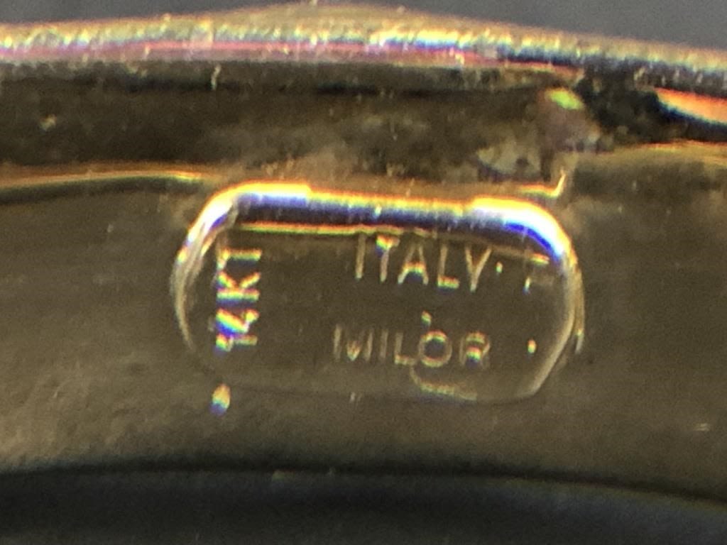 Marked “14 KT ITALY MILOR” inside bangle. 2 1/4″ x 2 1/2″ interior dimensions. 2.5″ x 2 7/8″ exterior dimensions. 7.31 grams.