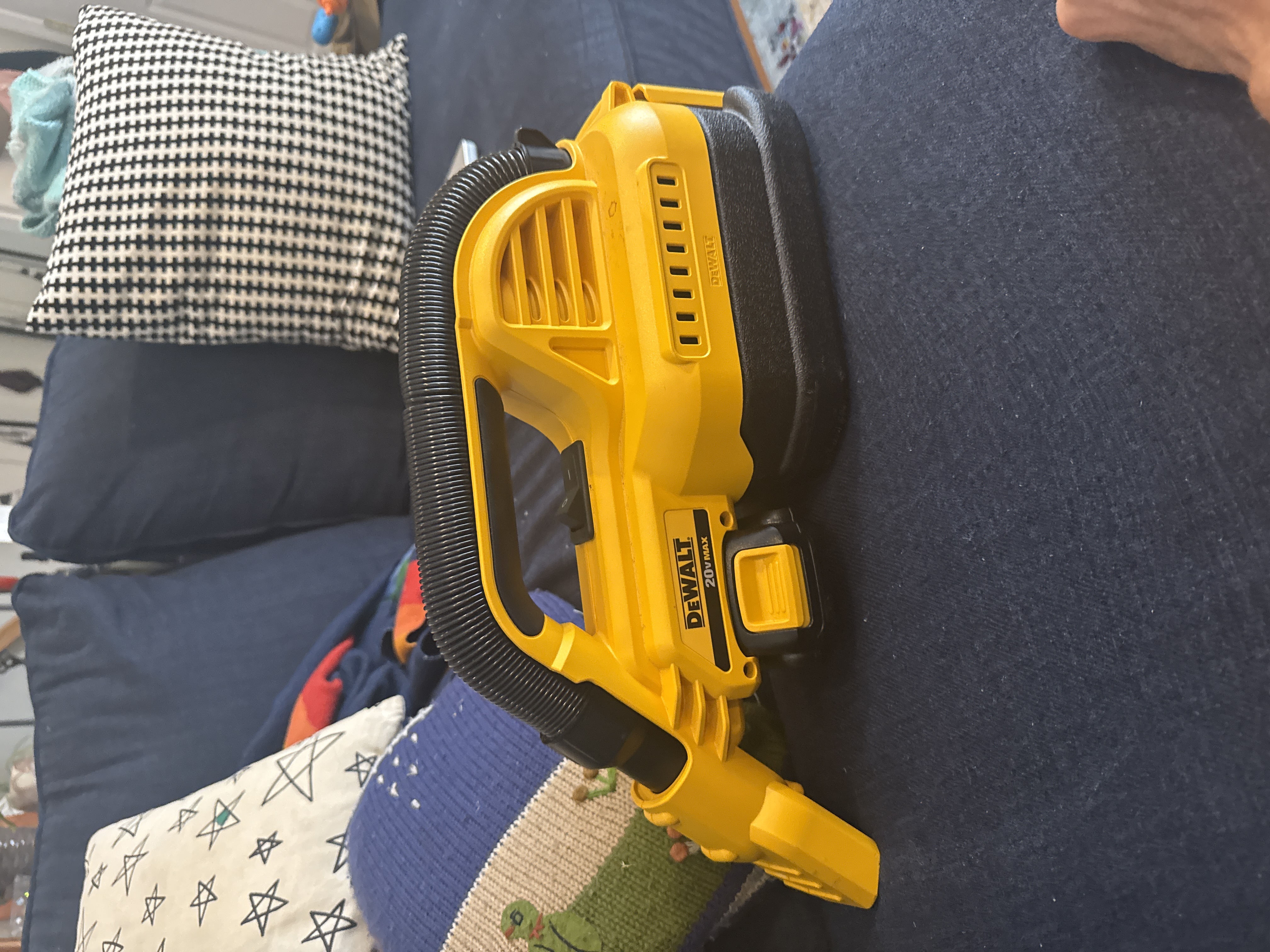 A DEWALT 20V MAX 1/2 Gallon Wet/Dry Portable Vacuum. This contemporary, industrial-style handheld vacuum cleaner is primarily constructed from bright yellow and black plastic, featuring a flexible black corrugated hose and a black rubberized handle grip. Visible markings include the brand name “DEWALT” prominently displayed, along with “20V MAX” indicating its power specification, and another “DEWALT” logo near the unit’s vents.