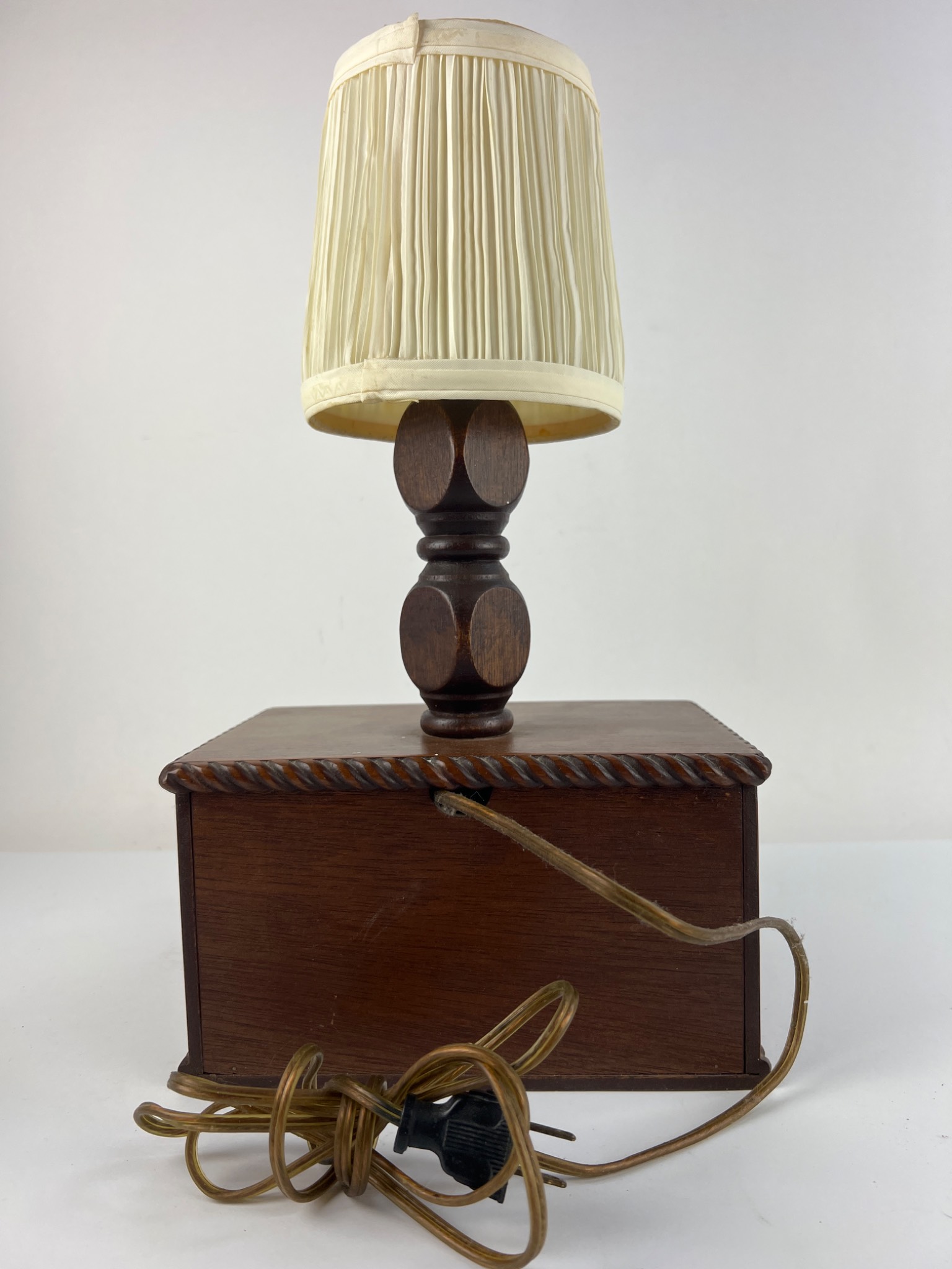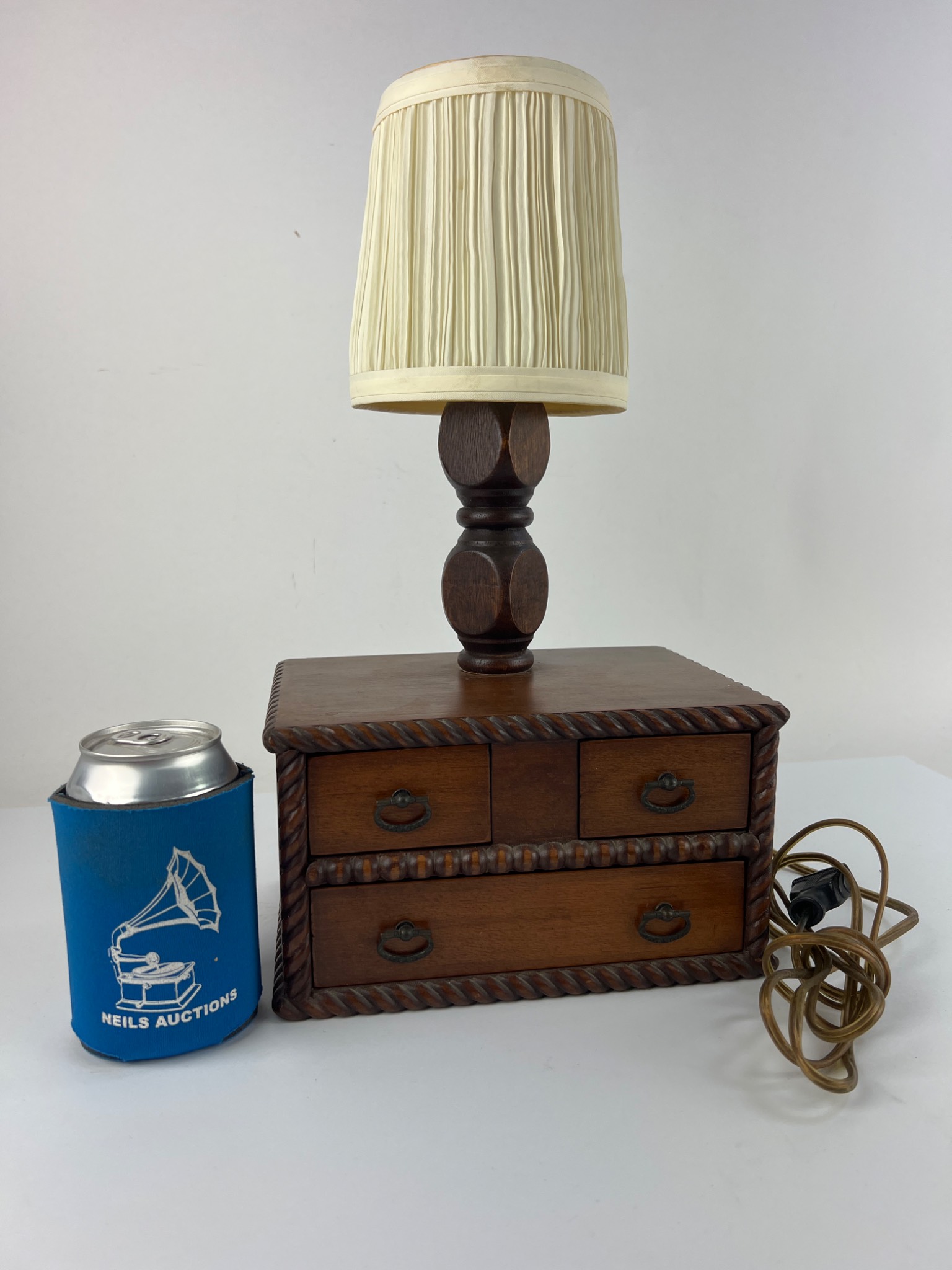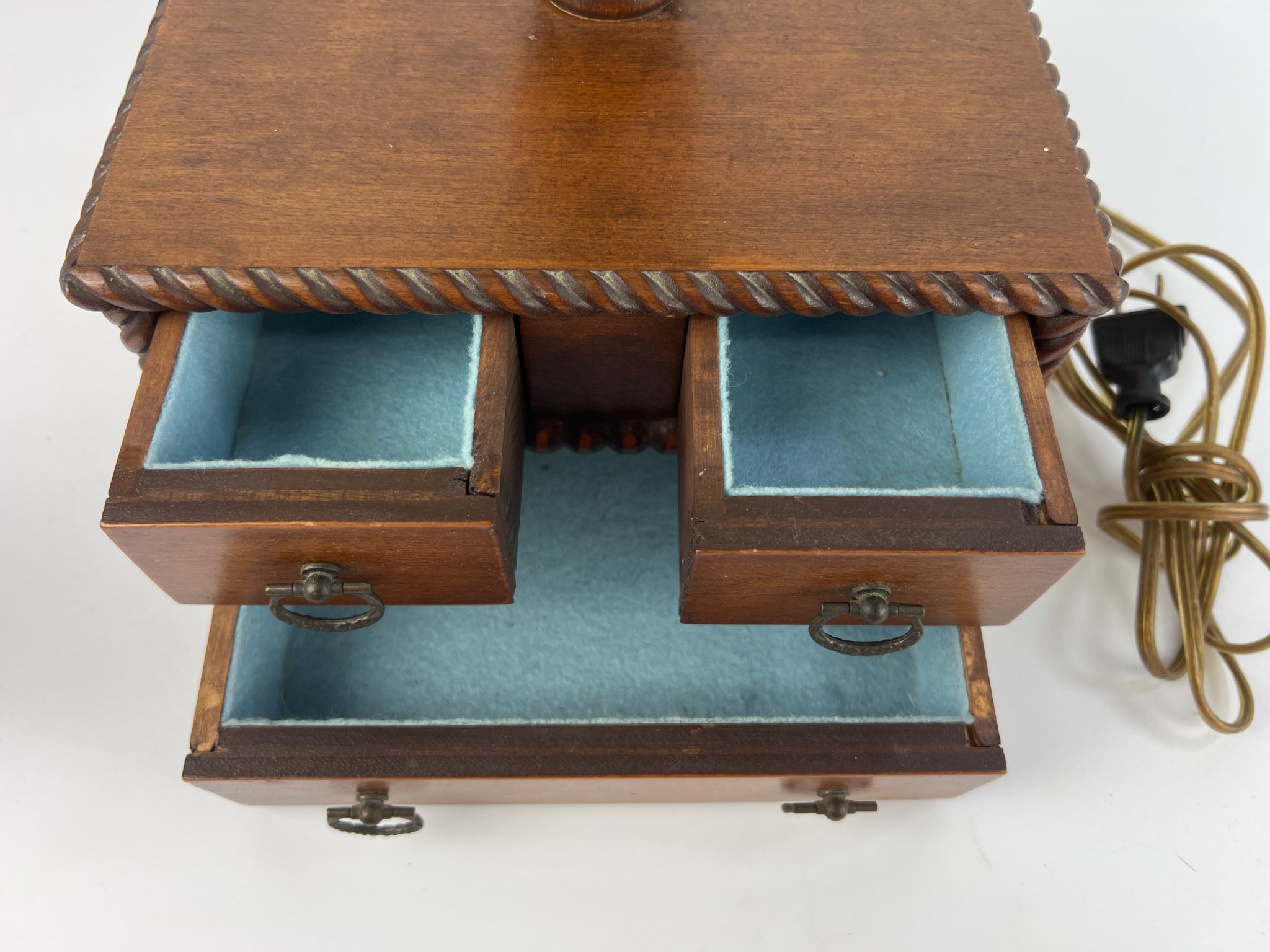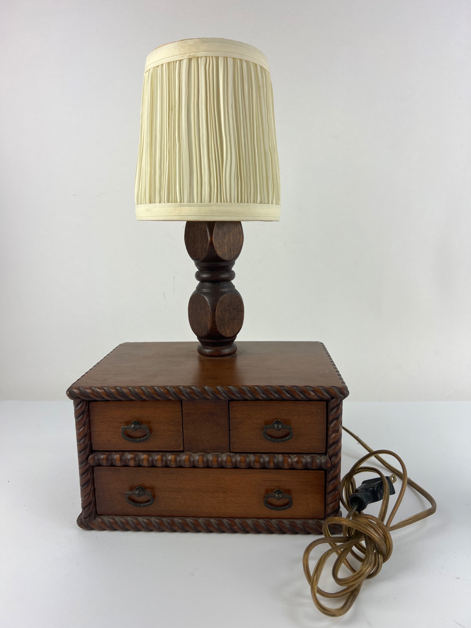 A 20th-century table lamp integrated into a miniature chest of drawers. The piece features a dark-stained wooden construction with carved rope-twist borders on the drawer unit and a turned lamp standard. It is topped with a pleated, off-white fabric shade. The chest unit contains four small drawers, two per row, each fitted with a brass-toned metal ring pull and lined with light blue felt-like material. An attached electrical cord with a two-prong plug is present. The lamp is not currently working.