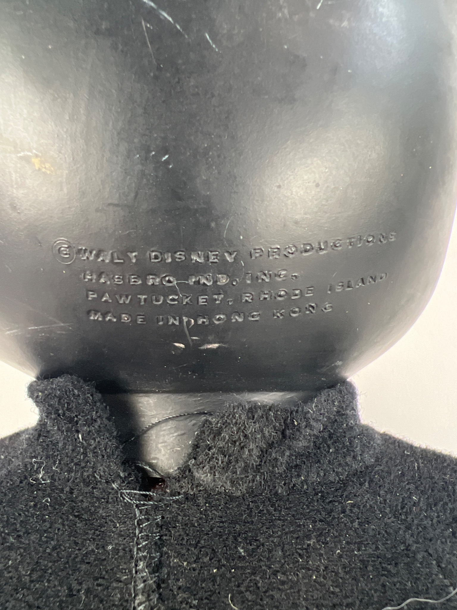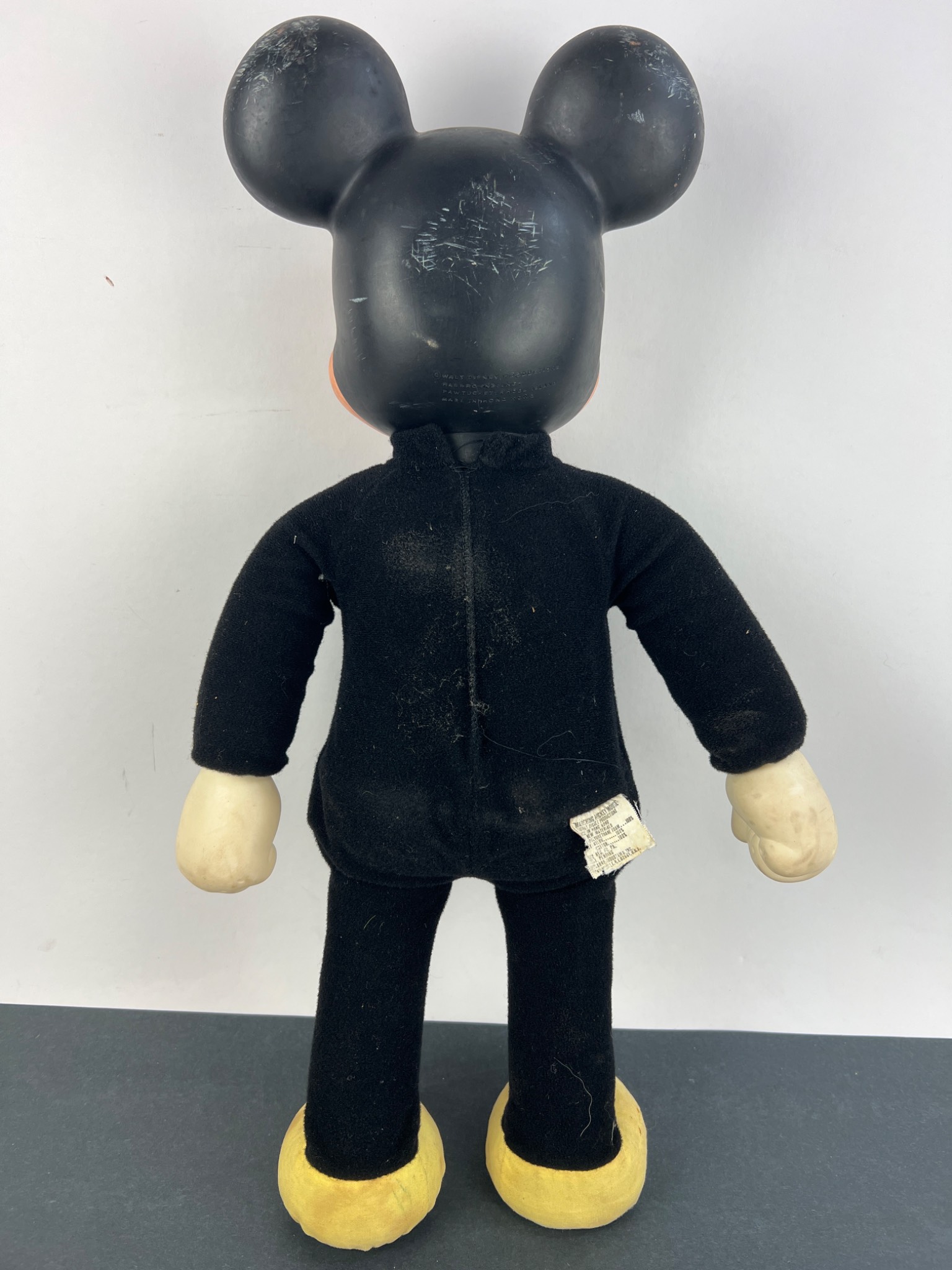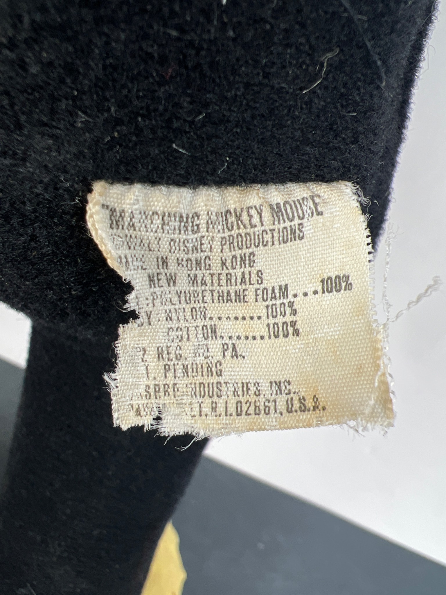 A vintage Hasbro ‘Marching Mickey Mouse’ character doll, dating to the 1970s. The doll features a black molded rubber or vinyl head with a flesh-toned face and off-white molded hands, attached to a black fabric body with yellow fabric feet and brown soles. The back of the head is embossed with “© WALT DISNEY PRODUCTIONS HASBRO IND. INC. PAWTUCKET, RHODE ISLAND MADE IN HONG KONG.” A frayed fabric tag on the reverse of the body further identifies it as “MARCHING MICKEY MOUSE” and indicates materials including polyurethane foam, nylon, and cotton, also crediting “WALT DISNEY PRODUCTIONS” and “MADE IN HONG KONG.”