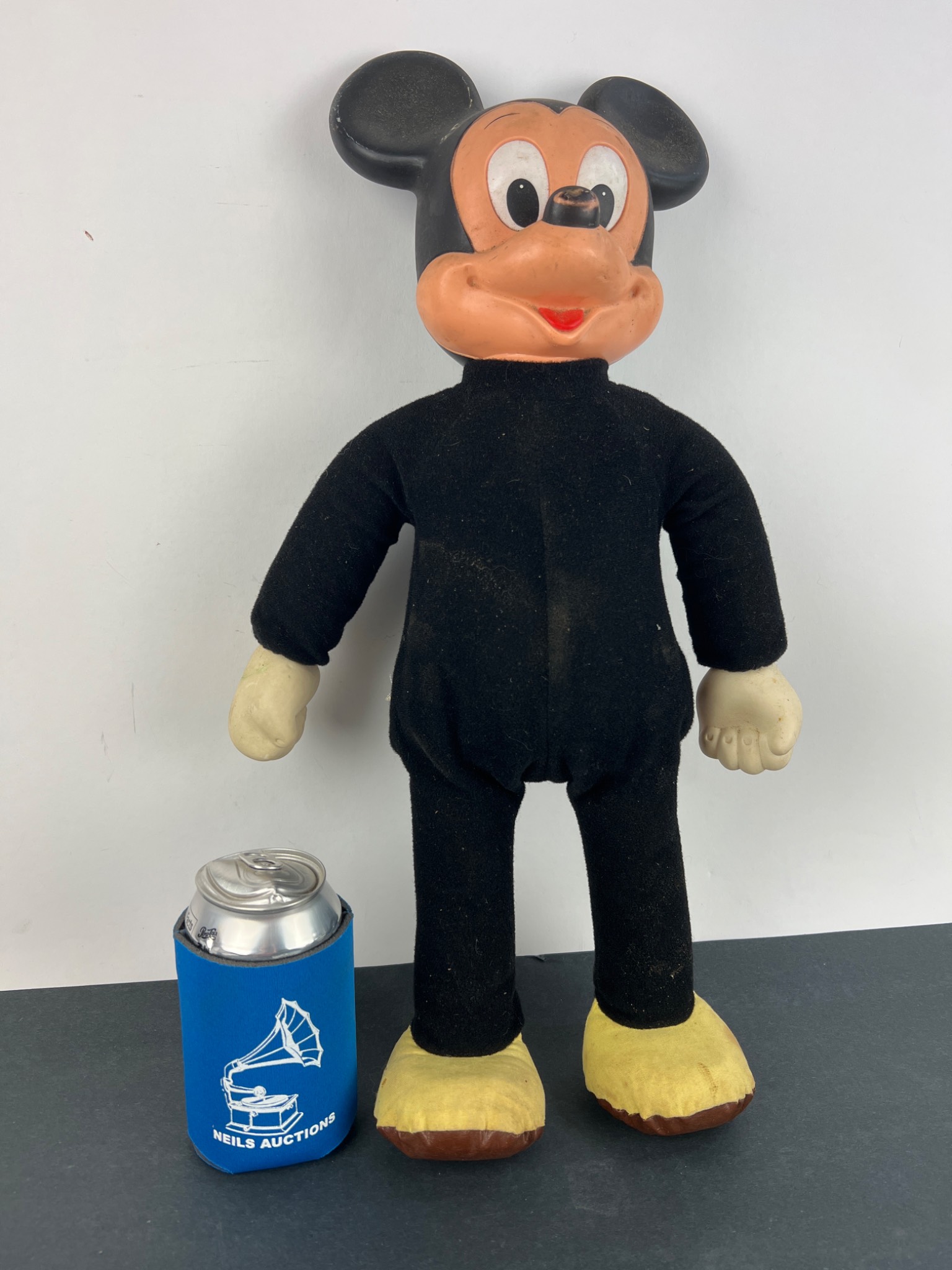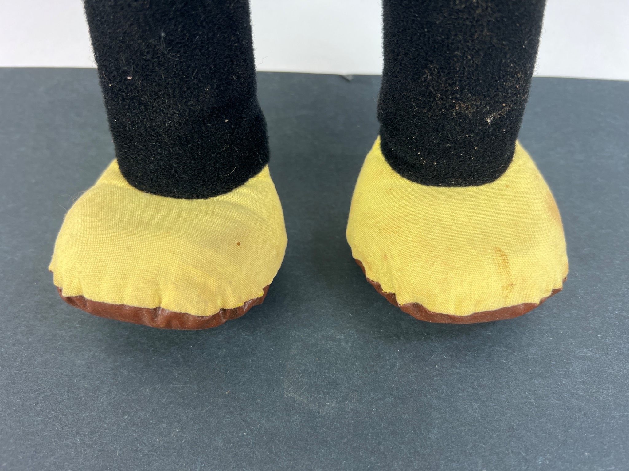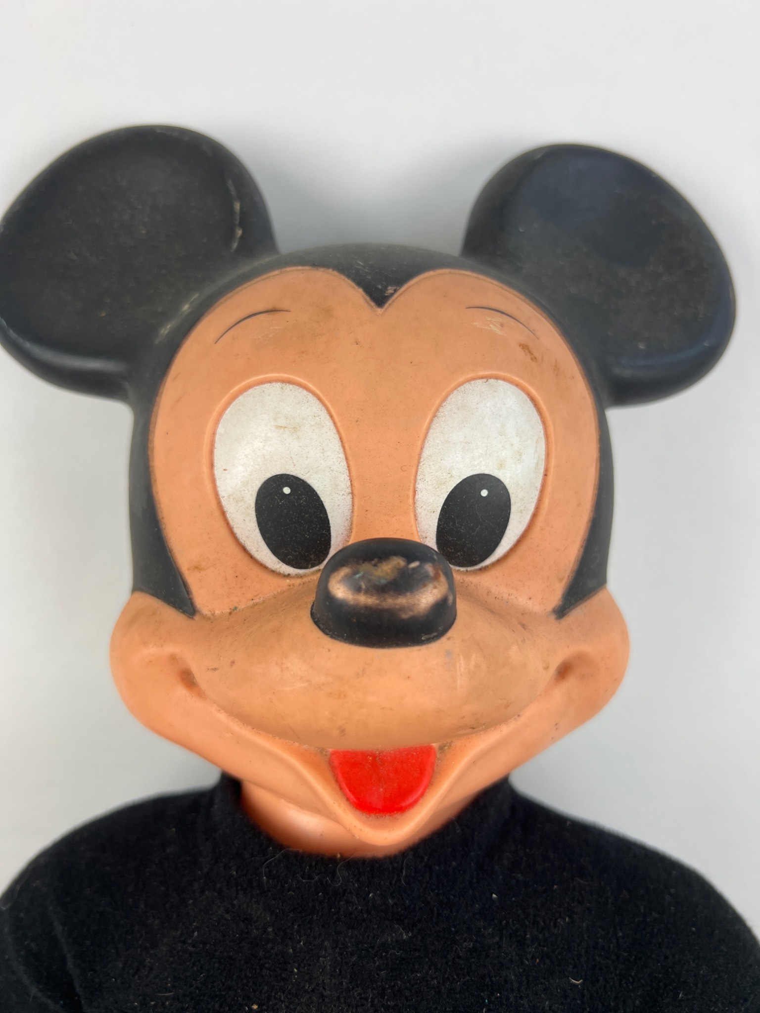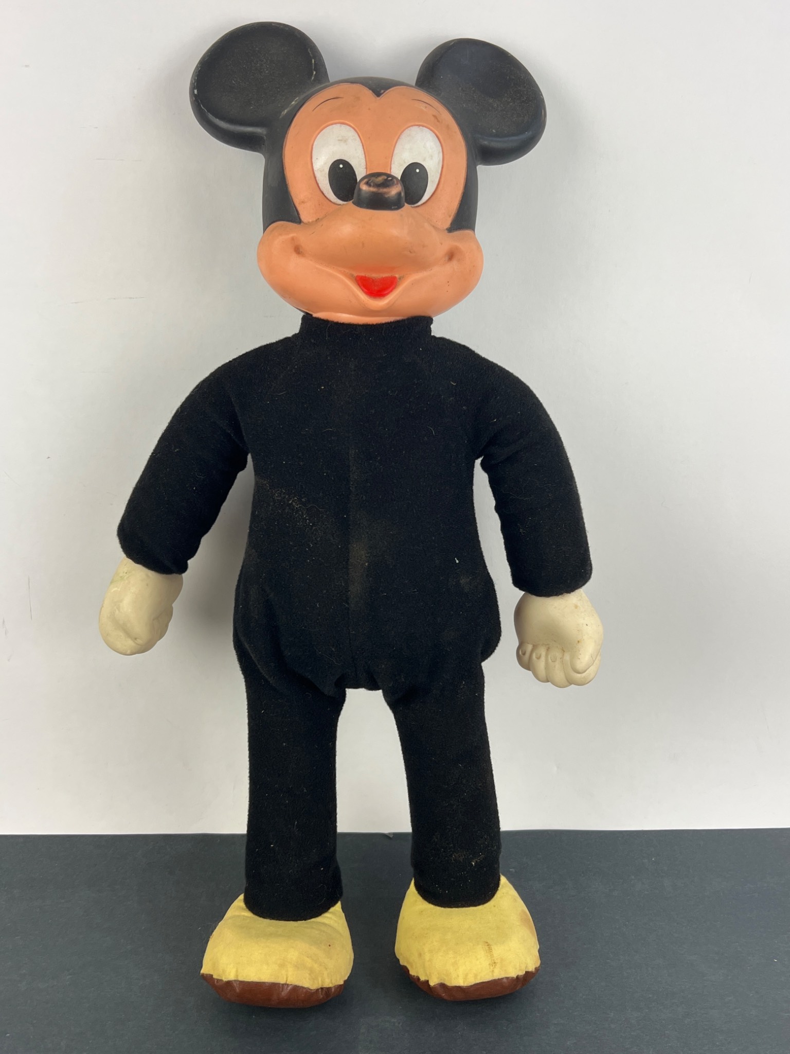 A vintage Hasbro ‘Marching Mickey Mouse’ character doll, dating to the 1970s. The doll features a black molded rubber or vinyl head with a flesh-toned face and off-white molded hands, attached to a black fabric body with yellow fabric feet and brown soles. The back of the head is embossed with “© WALT DISNEY PRODUCTIONS HASBRO IND. INC. PAWTUCKET, RHODE ISLAND MADE IN HONG KONG.” A frayed fabric tag on the reverse of the body further identifies it as “MARCHING MICKEY MOUSE” and indicates materials including polyurethane foam, nylon, and cotton, also crediting “WALT DISNEY PRODUCTIONS” and “MADE IN HONG KONG.”