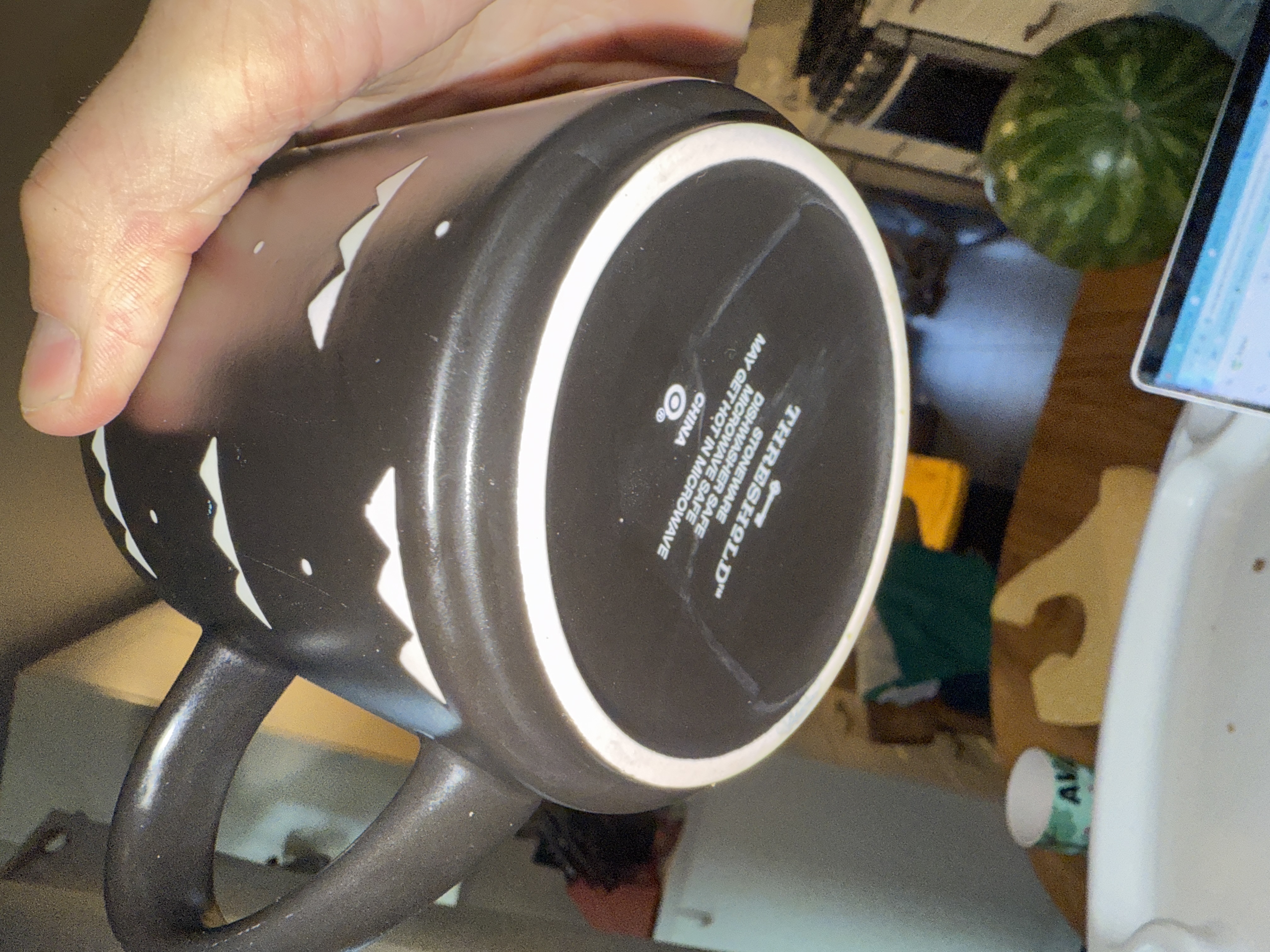 A contemporary stoneware mug by Threshold™. The mug is primarily black with a white interior rim and exterior decoration featuring stylized white mountain peaks and scattered white dots. The base is marked with white text reading “THRESHOLD™”, “STONEWARE”, “DISHWASHER SAFE”, “MICROWAVE SAFE”, “MAY GET HOT IN MICROWAVE”, and “CHINA”, along with a circular brand logo.