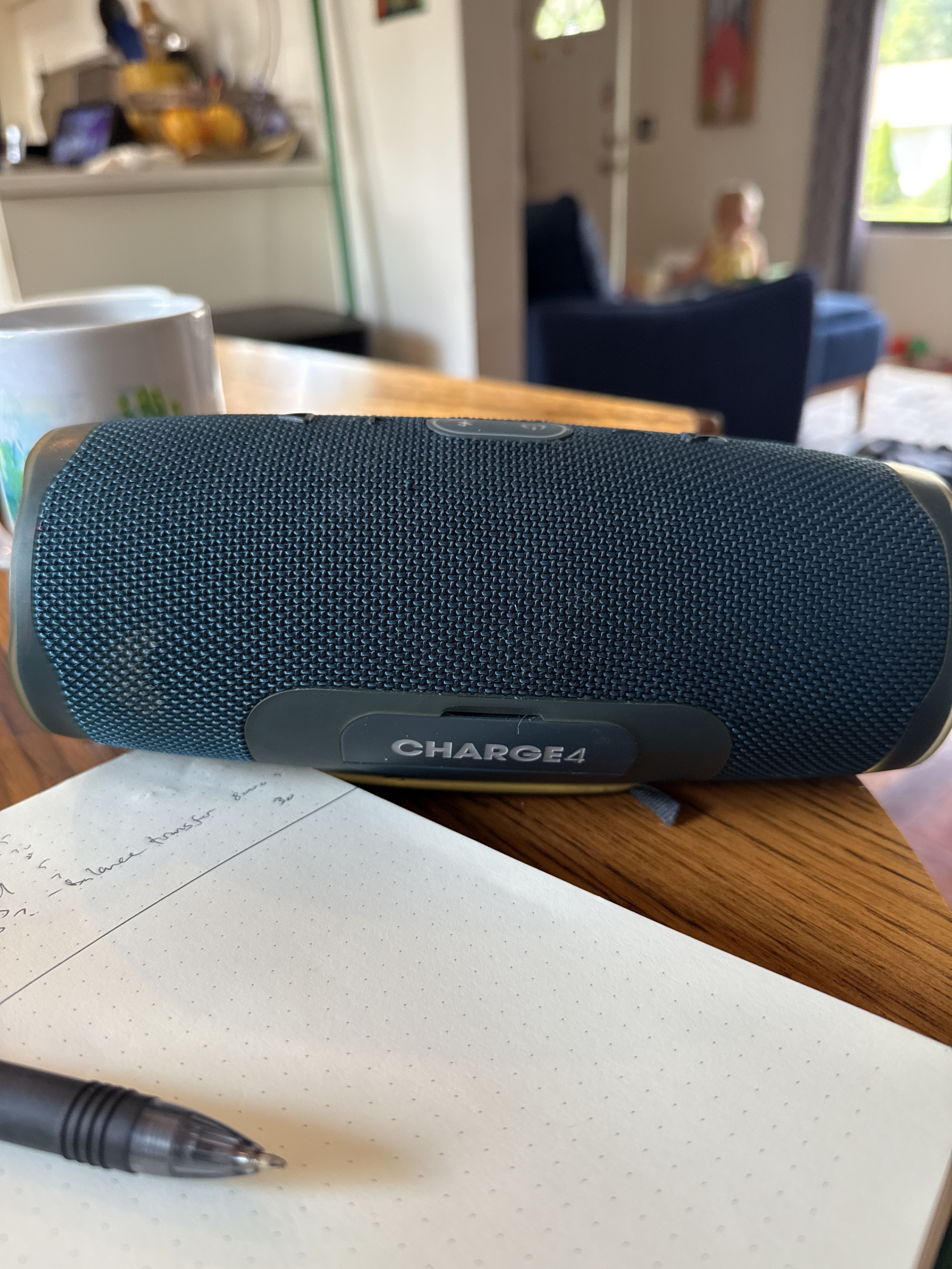 A JBL Charge 4 Portable Bluetooth Speaker, cylindrical in form, featuring a dark teal or navy blue woven fabric grille. It has darker, possibly rubberized, end caps. The front displays the white text “CHARGE 4” within a recessed grey panel, and one end cap is embossed with the “JBL” logo. This model is known to be waterproof.