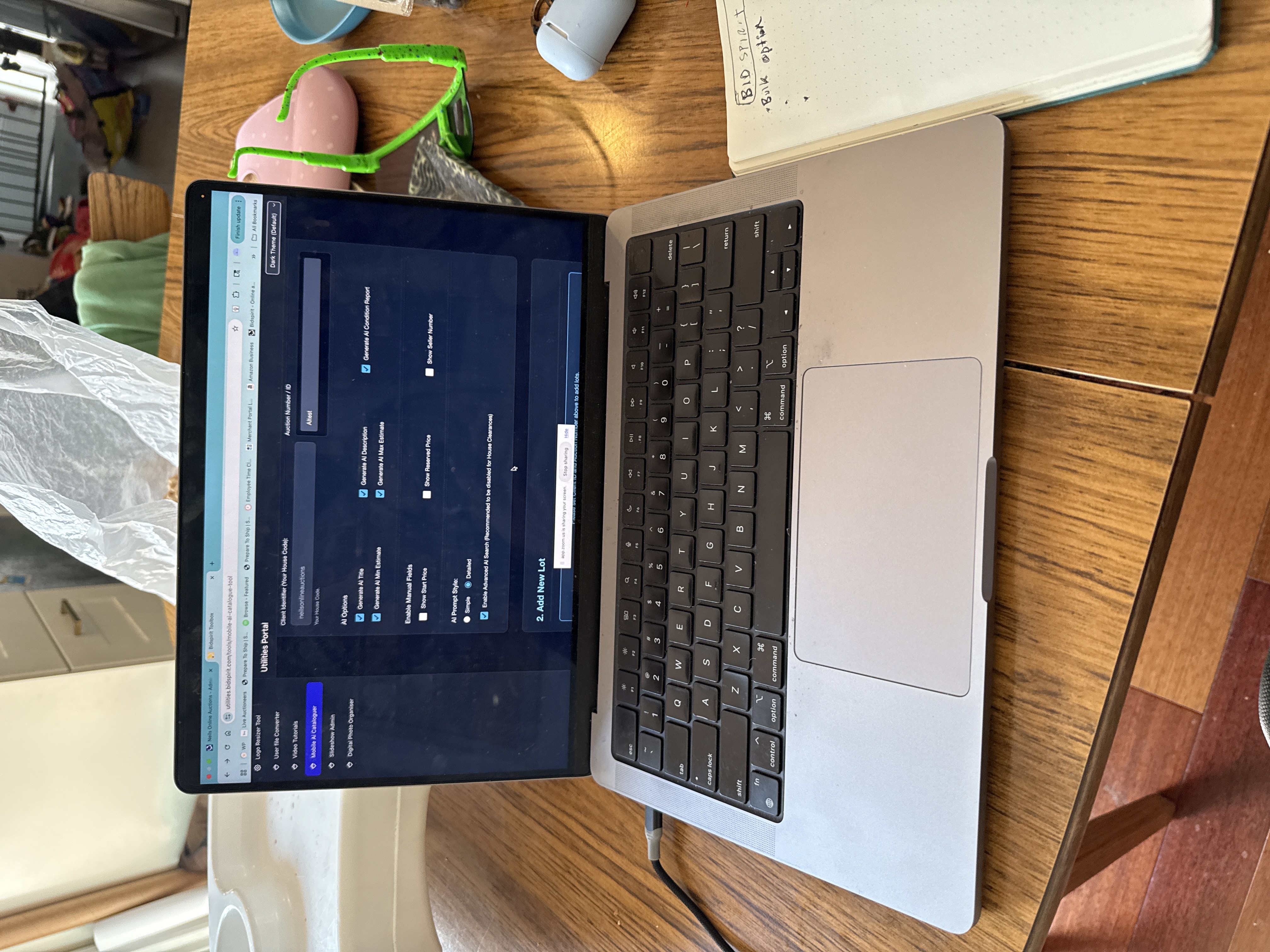 A modern Apple MacBook Pro laptop computer, silver-colored, constructed primarily of aluminum for the chassis with dark composite keys and a glass screen. The screen is actively displaying an “Utilities Portal” interface for “Bidspirit” auction management software, showing various options such as “Generate AI Title,” “Generate AI Description,” and a client identifier “neilsononlineauctions.” An adjacent notebook contains handwritten text reading “BID SPIRIT” and “Bulk option.”