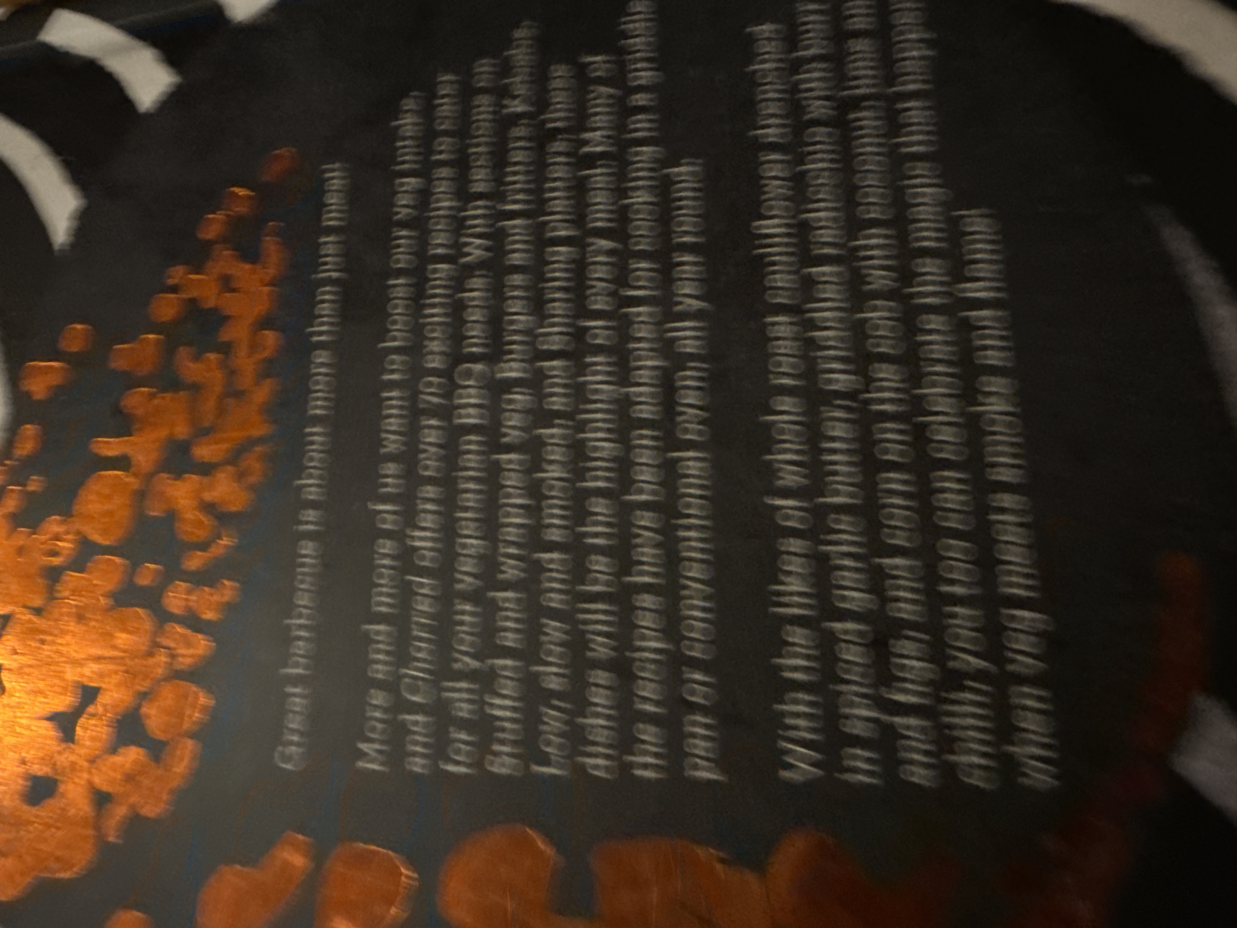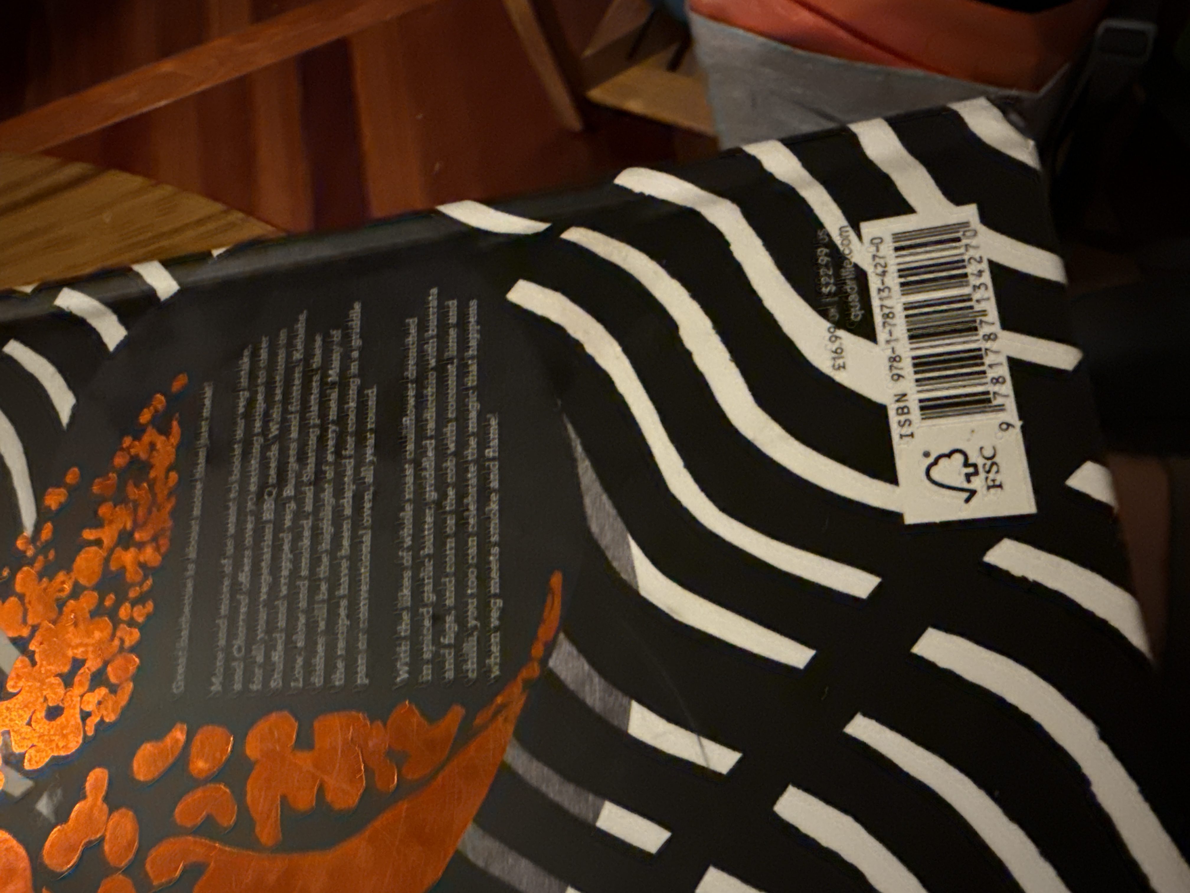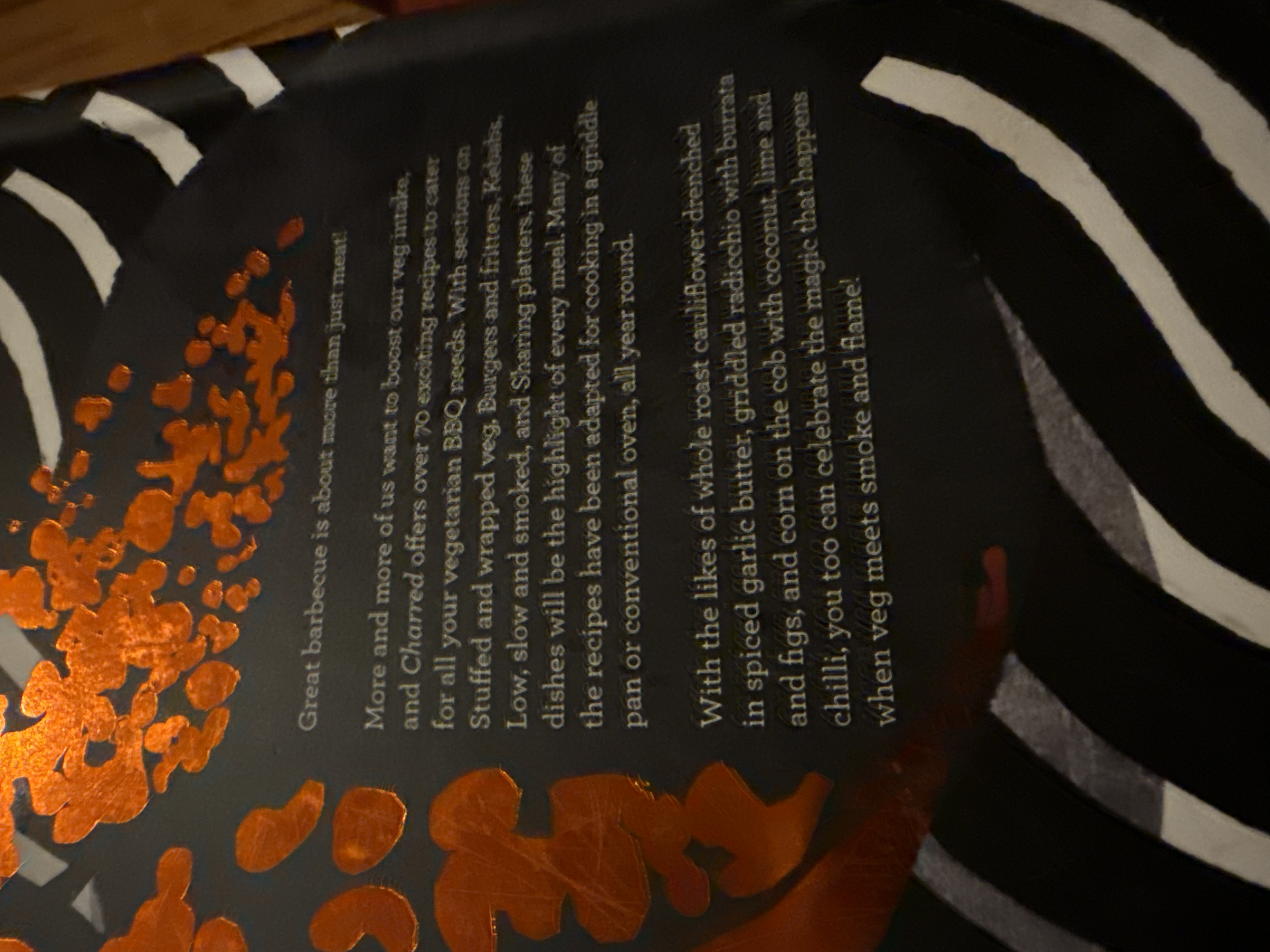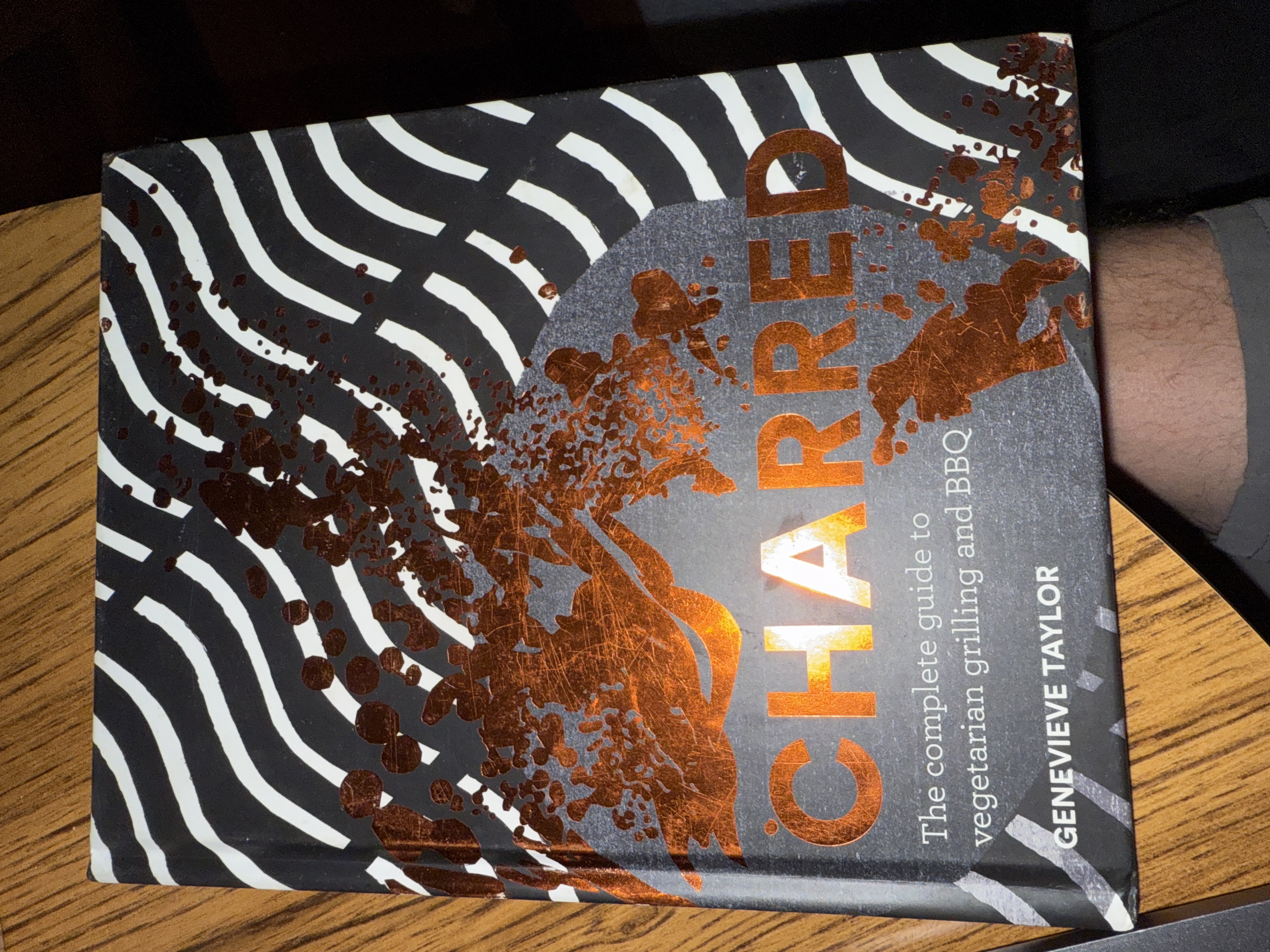 A contemporary hardcover book titled ‘CHARRED,’ authored by Genevieve Taylor, presented as ‘The complete guide to vegetarian grilling and BBQ.’ The design features a black background with white wavy lines and metallic copper/bronze foil graphics resembling smoke or embers. The back cover details over 70 vegetarian BBQ recipes. The book displays a retail price of £16.99 / $22.99, the publisher’s website (quadrille.com), and an ISBN (978-1-78713-427-0). An FSC logo is also present, indicating responsibly sourced paper.