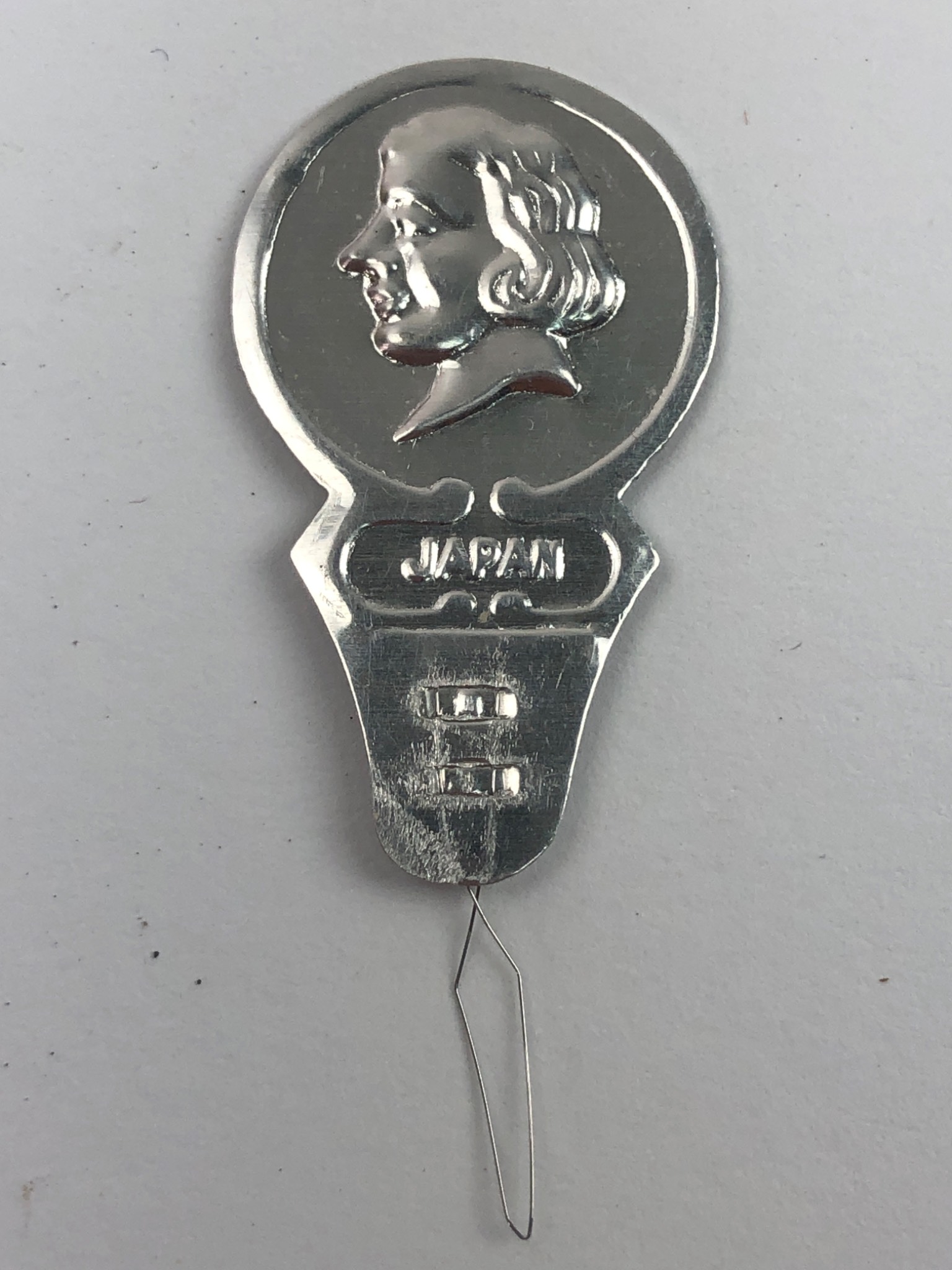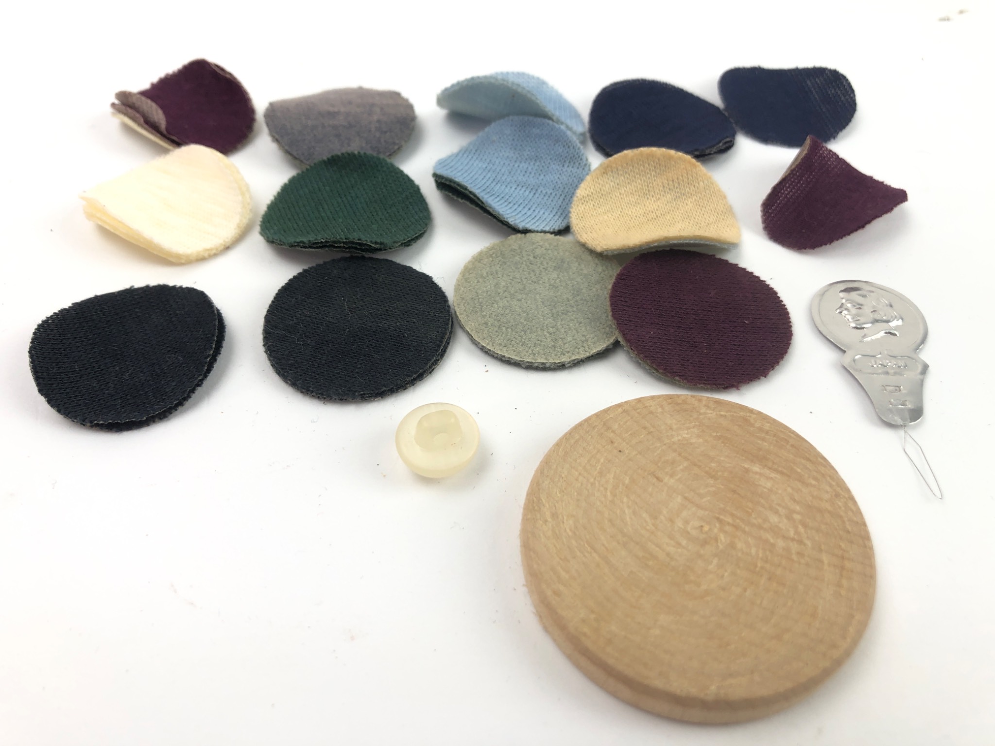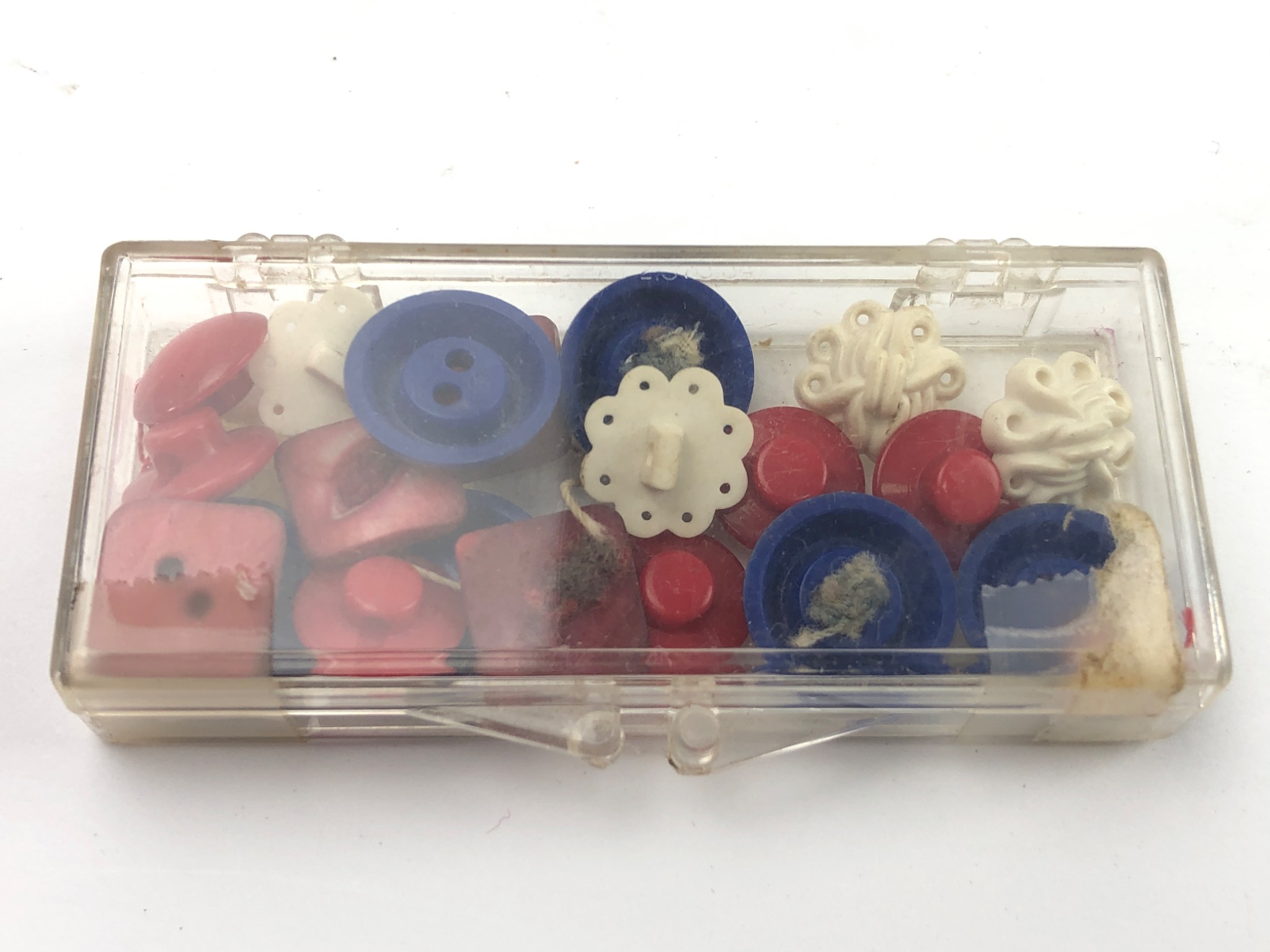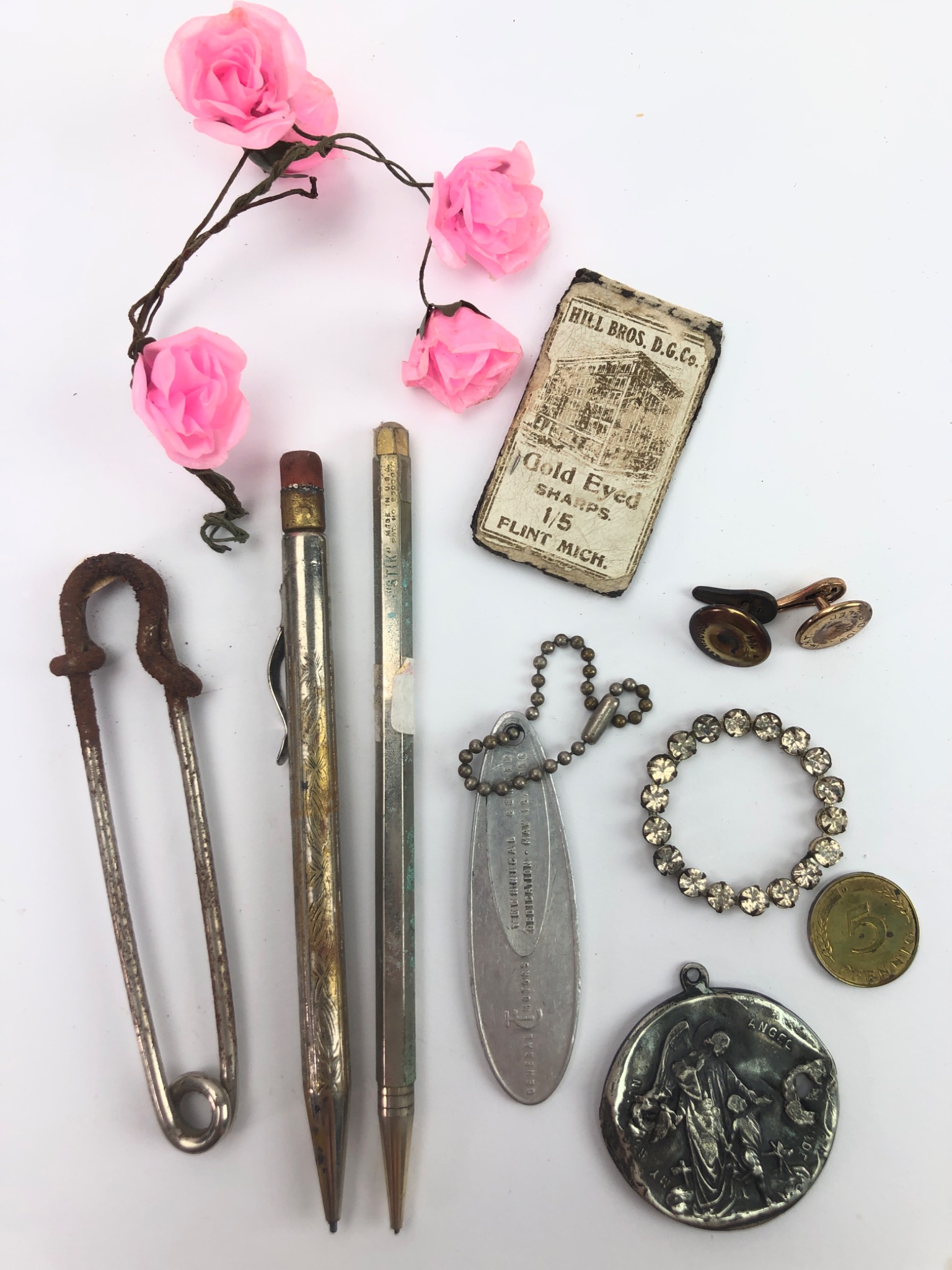 A diverse collection of vintage personal, household, and sewing-related items, largely appearing to be from the early to mid-20th century. The lot includes two worn mechanical pencils, one marked “W.H. HILLS NEW YORK” and the other “R.H. Macy & Co. New York”; a heavily rusted steel safety pin; a pair of brass-toned cufflinks; and a rhinestone-set circular brooch. Also present are a small cardboard box labeled “HILL BROS. D.G. Co. Gold Eyed SHARPS. 1/5 FLINT MICH.”; a metal keychain marked “PROPERTY OF… NEW YORK”; a tarnished silver-toned medallion featuring a relief image of an angel; and a US quarter coin. Additional components include a clear ribbed plastic storage box; an assortment of round fabric swatches; a small clear plastic container filled with various plastic and possibly shell/bone buttons; a plain wooden disc; and a metal needle threader marked “JAPAN” with a woman’s profile.