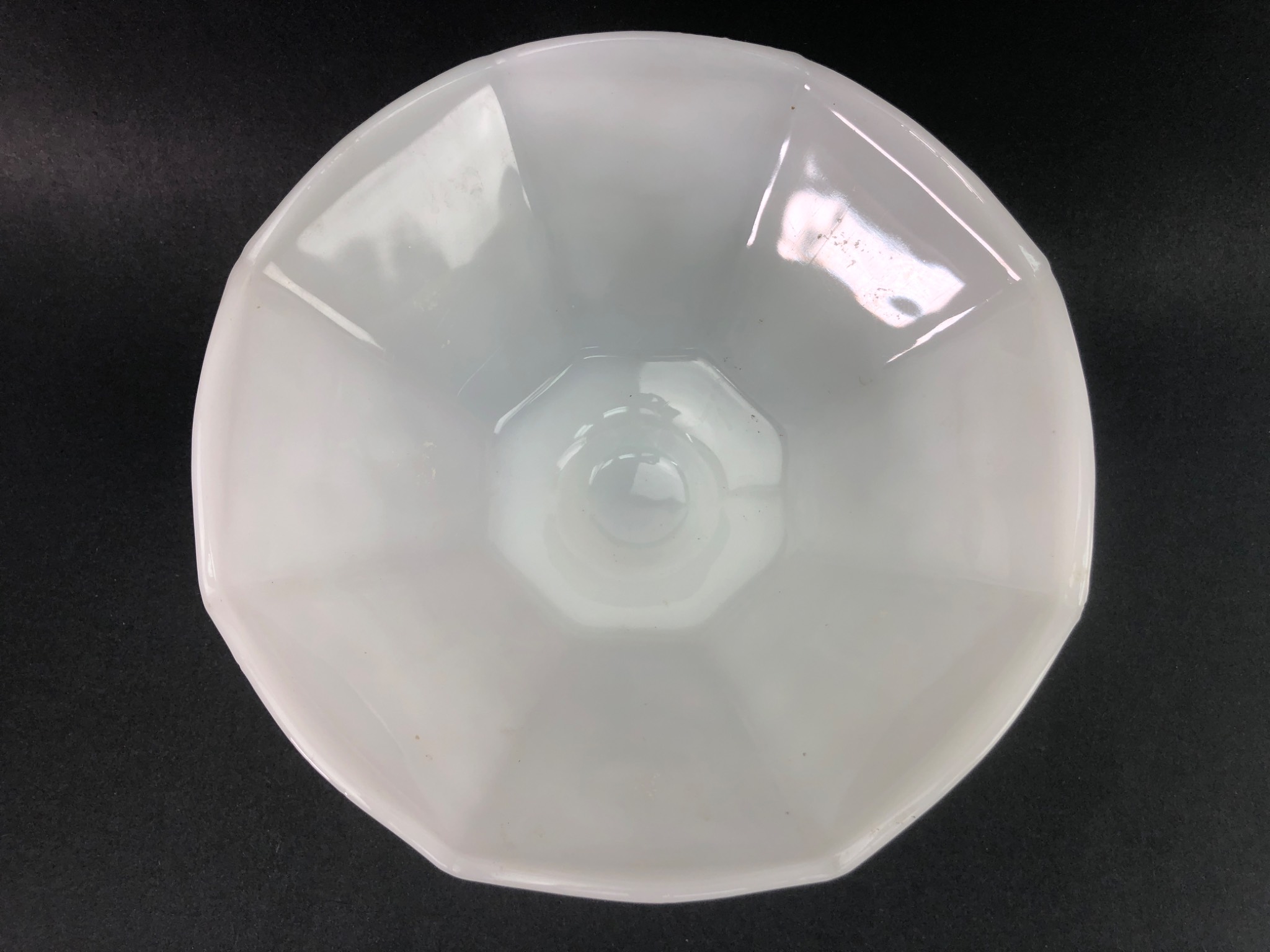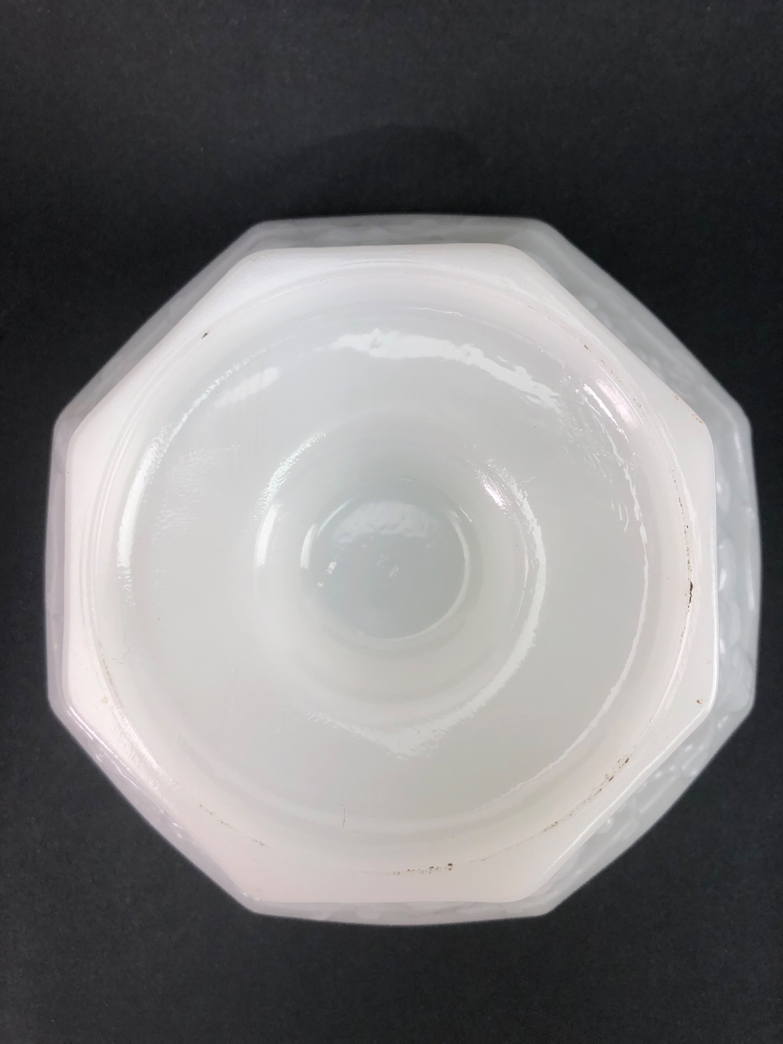 An Anchor Hocking white milk glass pedestal fruit bowl in the Grape pattern. Crafted from opaque white glass, this footed bowl features a flaring, octagonal body with a scalloped rim, set upon a conforming octagonal foot. The exterior is adorned with a raised, molded relief design of grape clusters and leaves. No manufacturer’s marks or other identifying text are visible.