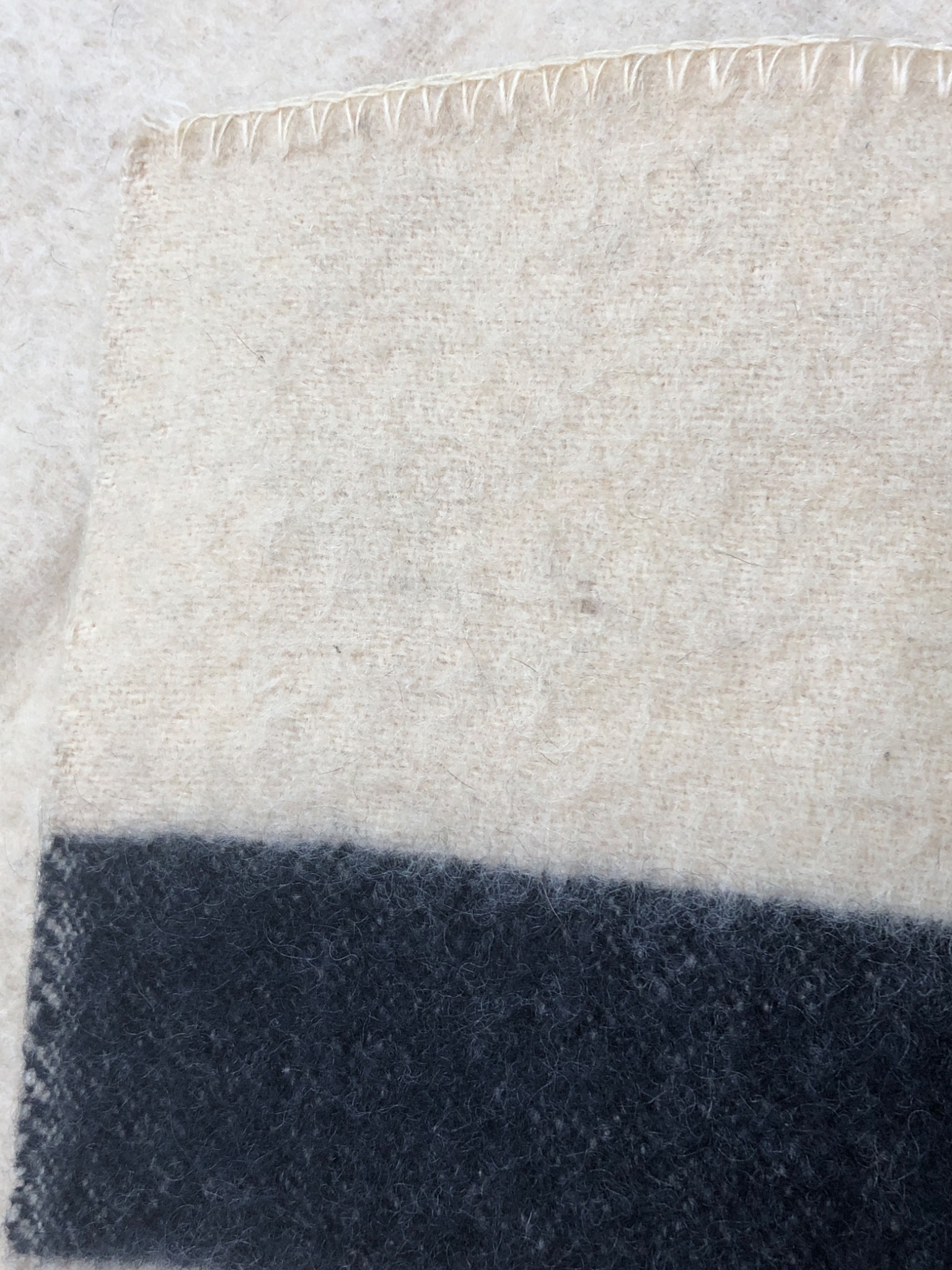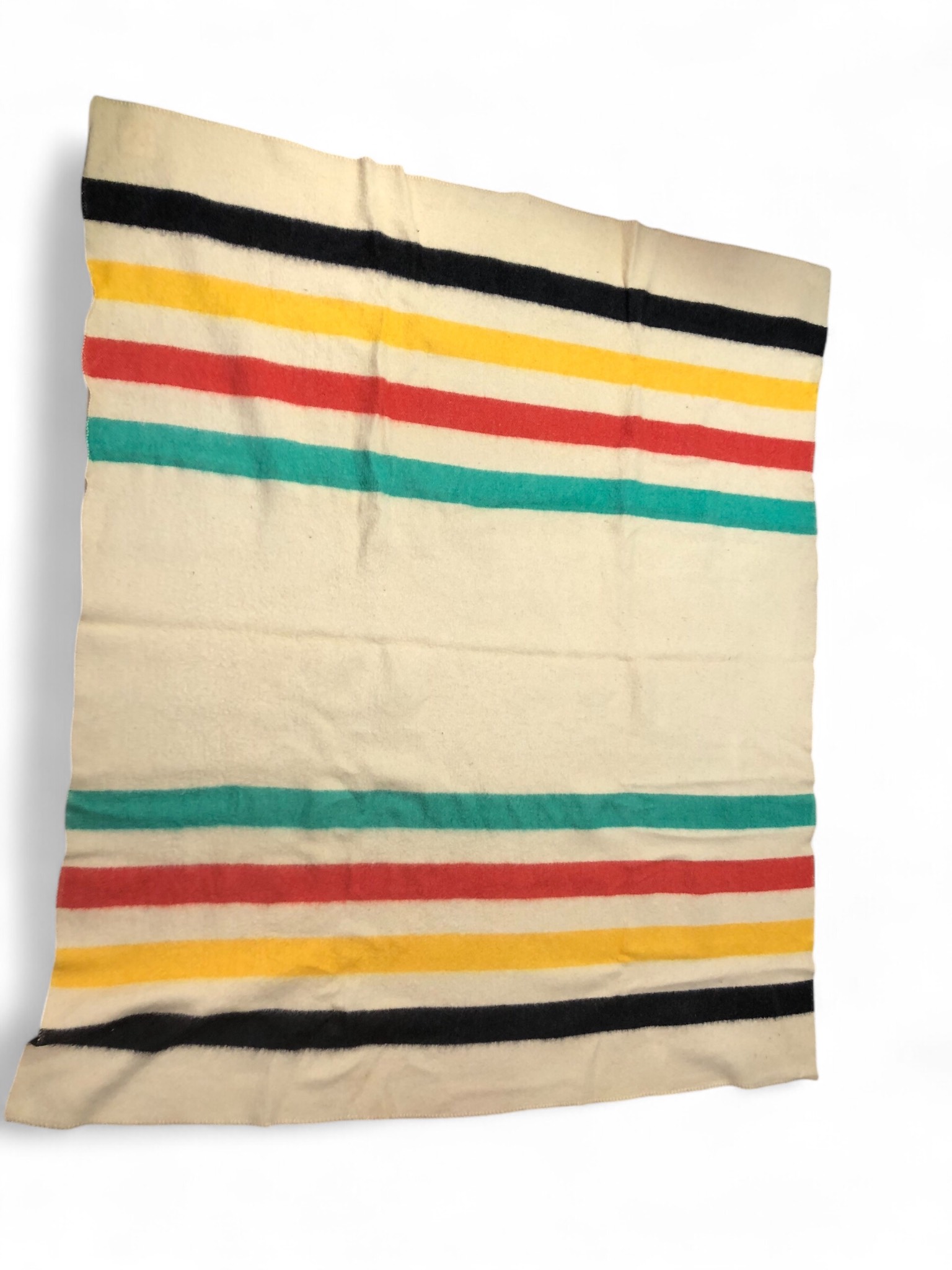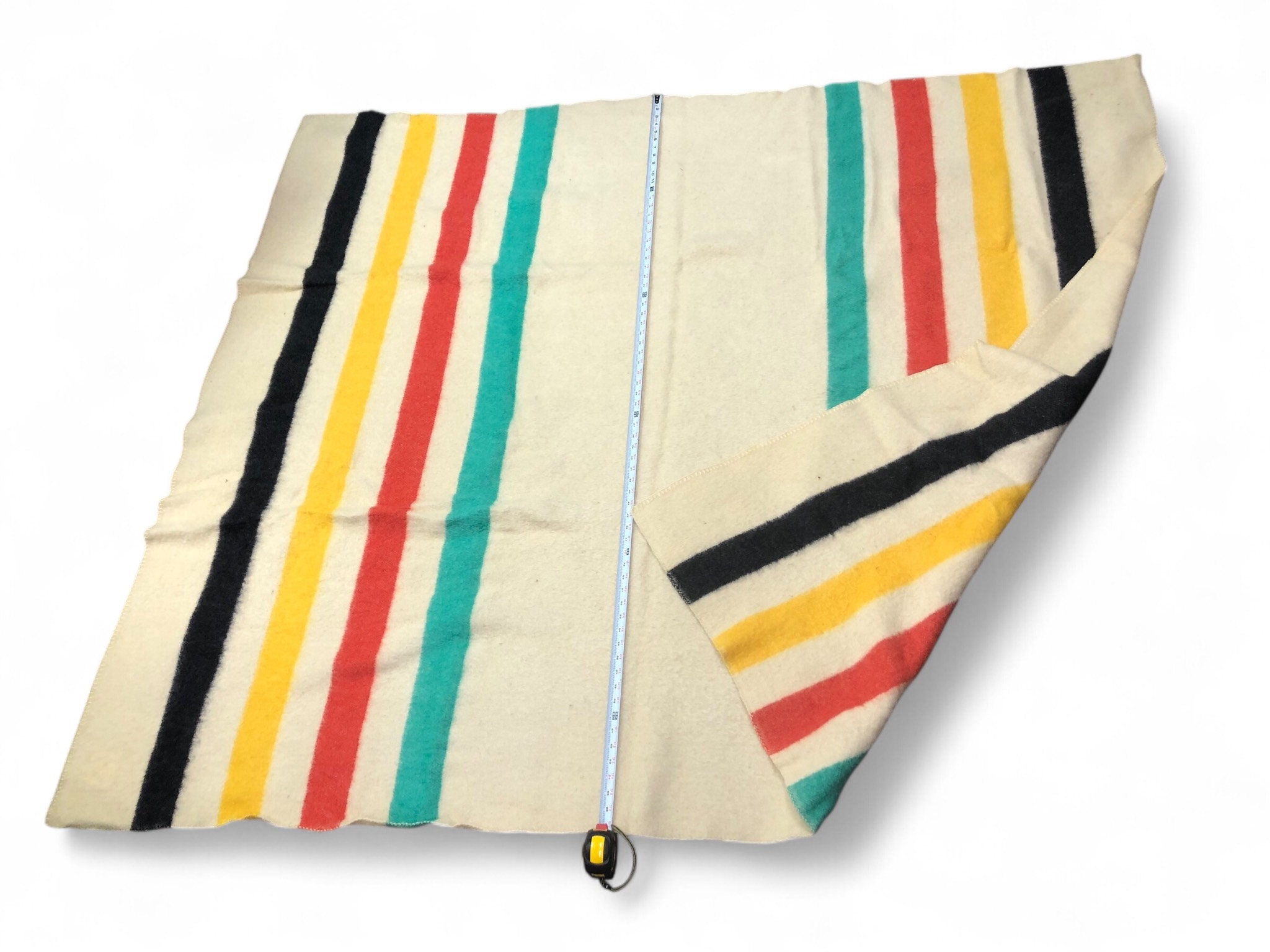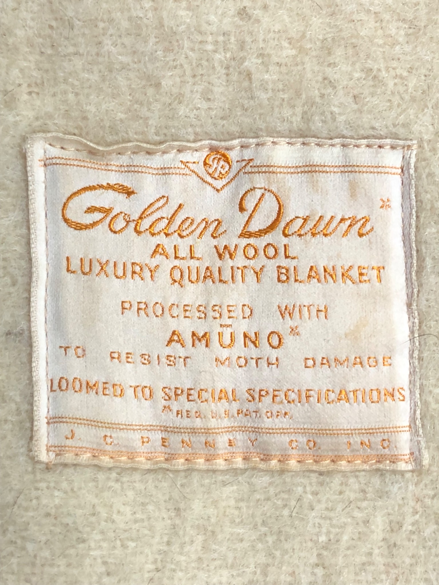 A J. C. Penney ‘Golden Dawn’ All Wool Luxury Quality Blanket, dating to the mid-20th century. The blanket features a traditional striped design on an off-white field, with prominent bands of black, yellow, red, and turquoise/teal, characteristic of the Hudson Bay Point Blanket style. A fabric label is affixed, reading “Golden Dawn ALL WOOL LUXURY QUALITY BLANKET PROCESSED WITH AMUNO % TO RESIST MOTH DAMAGE LOOMED TO SPECIAL SPECIFICATIONS J. C. PENNEY CO. INC.” The presence of the “J. C. Penney Co. Inc.” mark and the moth-proofing treatment further confirm its mid-20th century period. Web intelligence and visual matches frequently associate this design with ‘Hudson Bay Point Blankets’, indicating market recognition for this specific style.