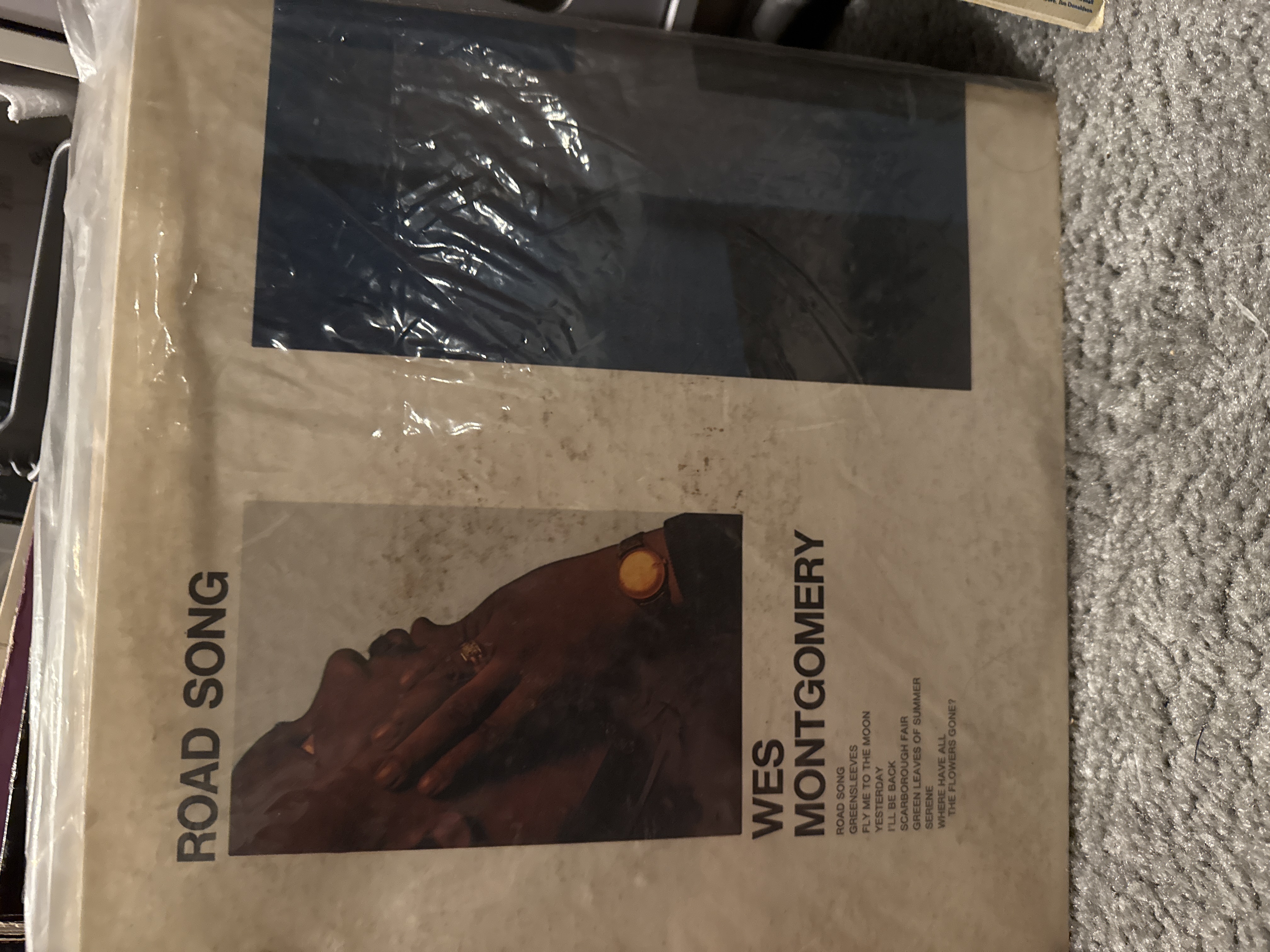 A vintage vinyl record album, Wes Montgomery – Road Song, A&M Records, 1968, Catalog No. A&M 3023. The album is housed within a transparent plastic protective sleeve. The paperboard album cover features the title “ROAD SONG” prominently at the top and the artist’s name, “WES MONTGOMERY,” below. The design includes a cropped photographic image of a person’s profile with a hand near their face, positioned to the left against a lighter, mottled background, with a large dark blue-black rectangular area occupying the right side of the cover. A partial tracklist is visible, including song titles such as “GREENSLEEVES,” “FLY ME TO THE MOON,” and “WHERE HAVE ALL THE FLOWERS GONE?”.