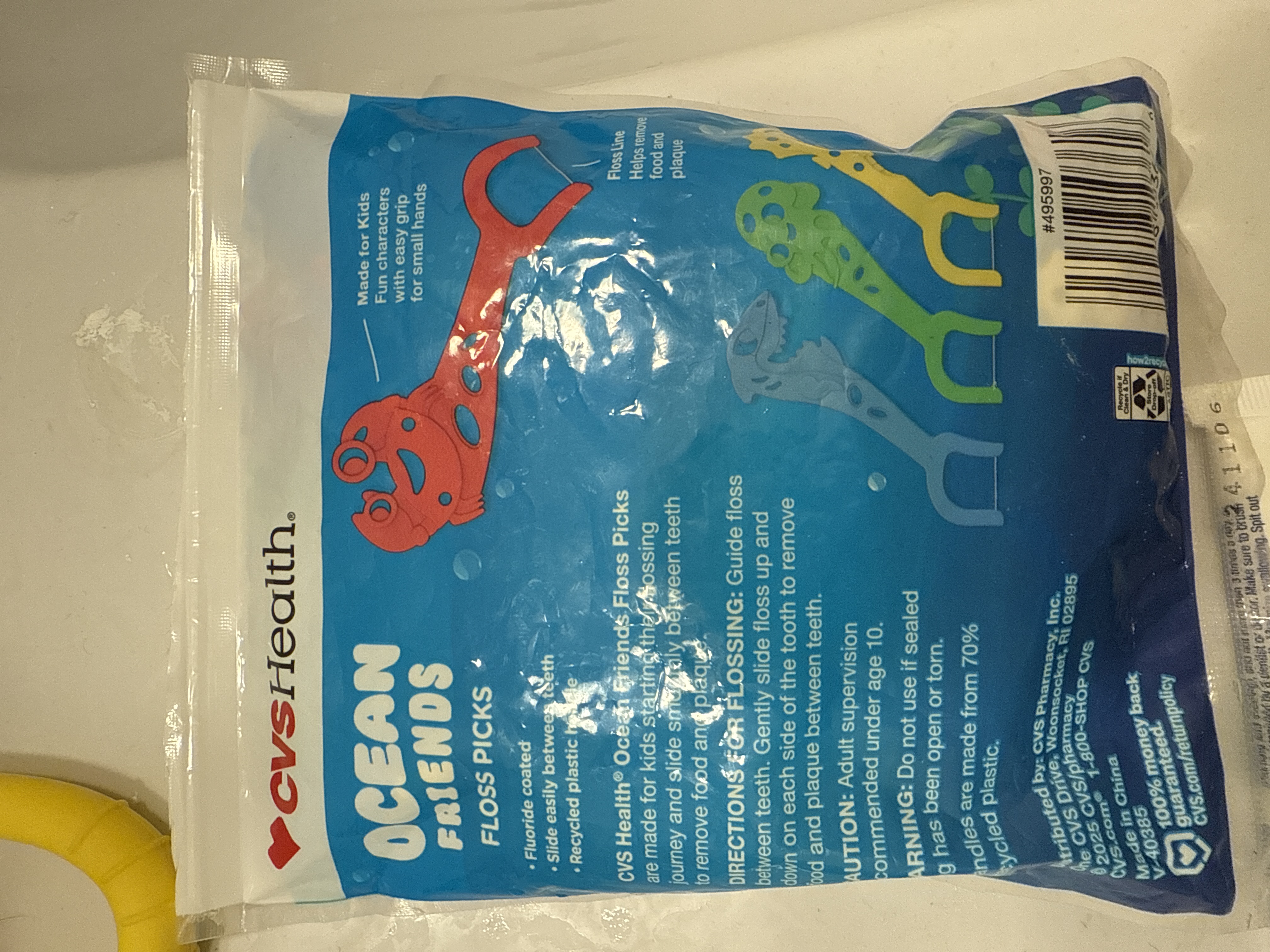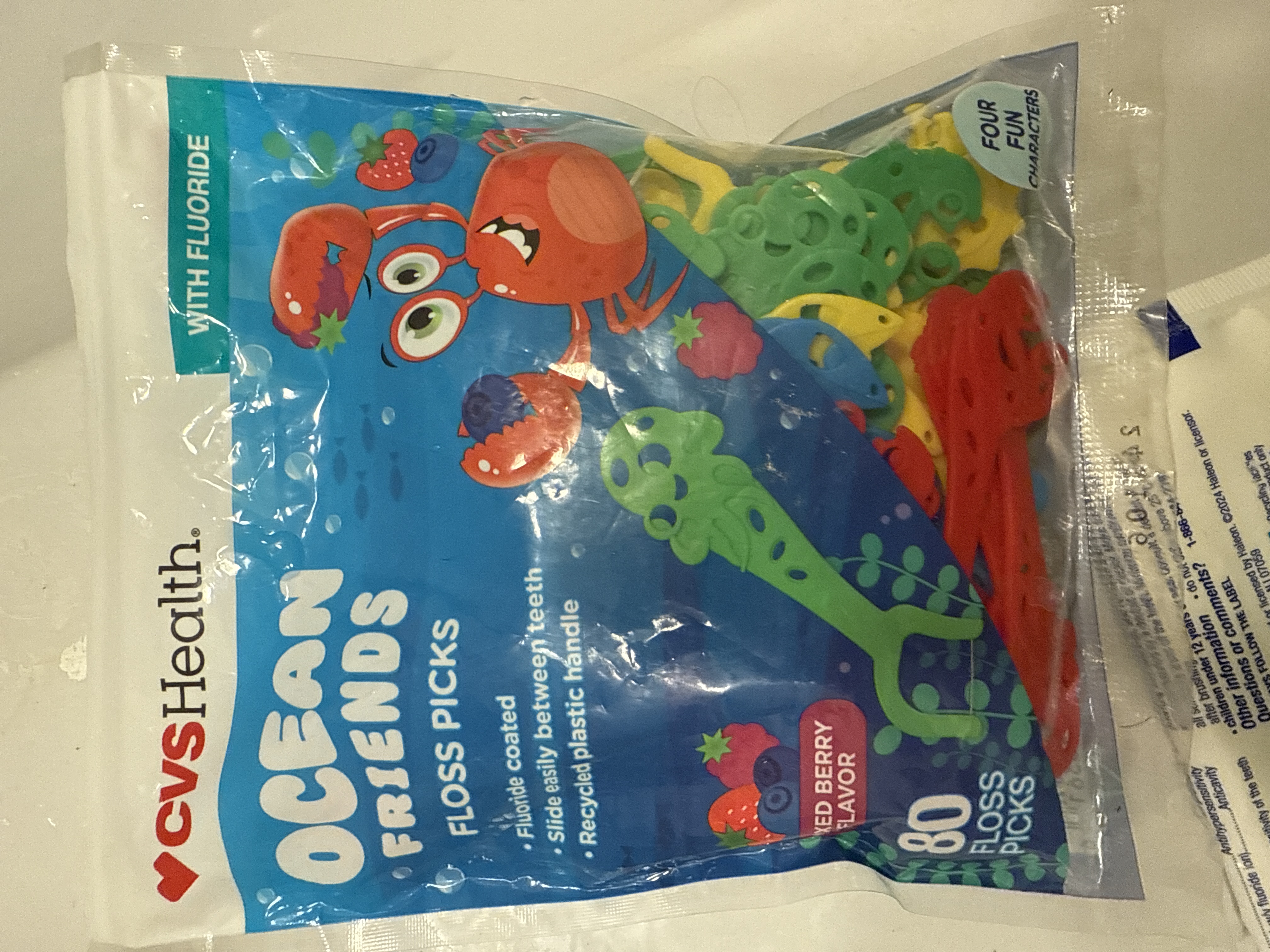 A new, factory-sealed package of CVS Health Ocean Friends Floss Picks with Fluoride. The clear plastic bag contains 80 colorful, plastic floss picks, visibly featuring various sea creature shapes including crab, mermaid, shark, and seahorse, presented in red, green, yellow, and blue. The packaging specifies “Mixed Berry Flavor,” “fluoride coated” floss, and handles made from 70% recycled plastic, all under a “Four Fun Characters” theme. Visible text includes usage directions, caution and warning labels, and manufacturing details indicating “Made in China” and distribution by CVS Pharmacy, Inc., with a 2023 copyright. The overall style is卡通-like and playful, with ocean-themed illustrations on a blue background.