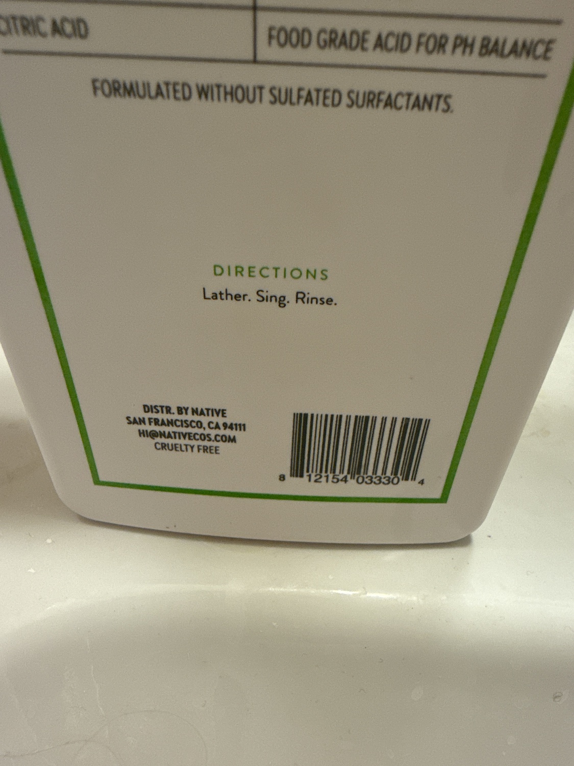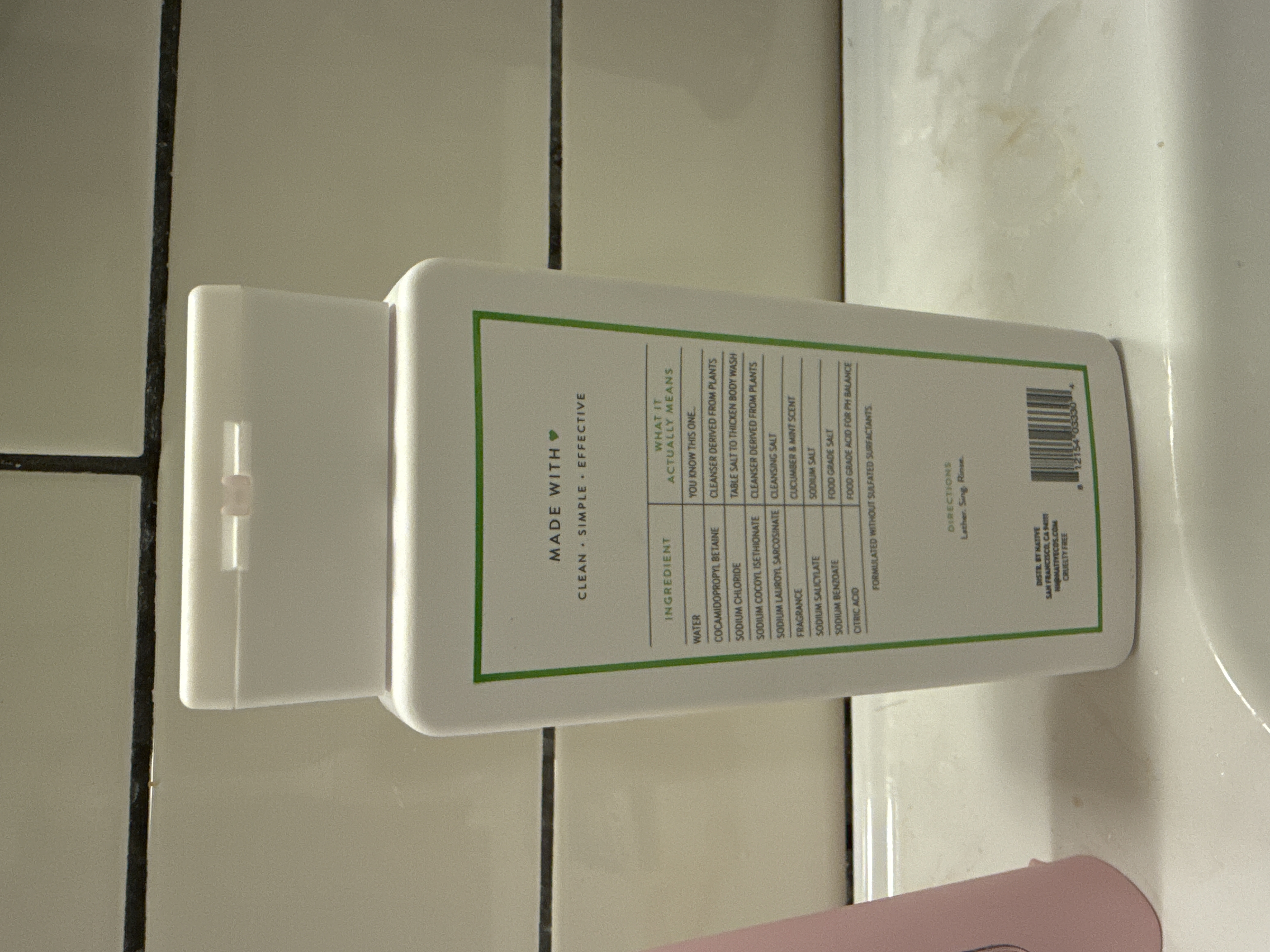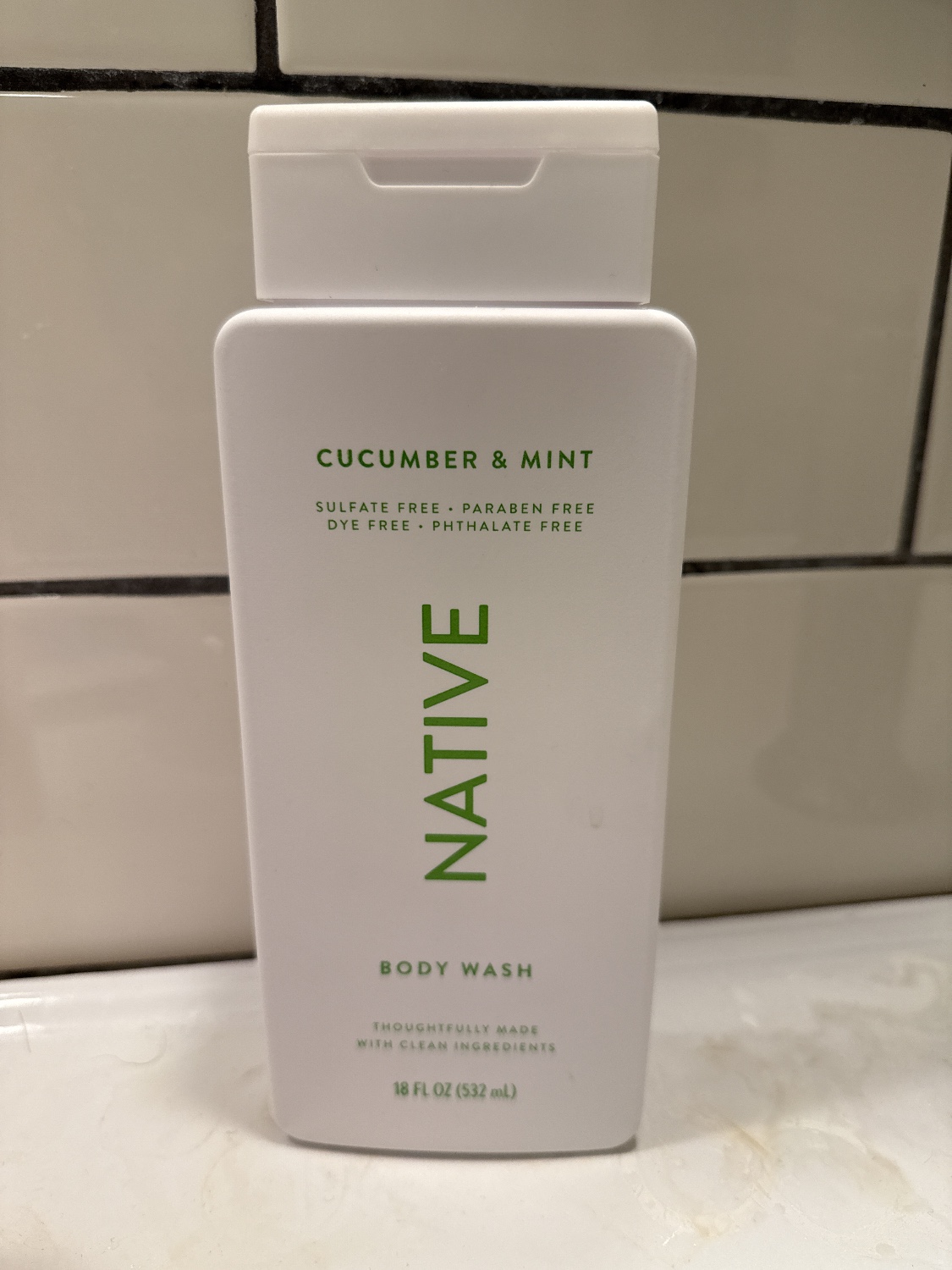 Native Body Wash in Cucumber & Mint scent. This contemporary, minimalist-style item is presented in a rectangular white plastic bottle with a flip-top cap. The front label indicates “SULFATE FREE – PARABEN FREE – DYE FREE – PHTHALATE FREE”. The reverse provides a list of “CLEAN • SIMPLE • EFFECTIVE” ingredients with explanations, “DIRECTIONS: Lather. Sing. Rinse.”, distribution information for Native in San Francisco, and a “CRUELTY FREE” declaration. The bottle contains 18 FL OZ (532 mL) of product. A barcode (8 12154 03330 4) is present on the reverse.