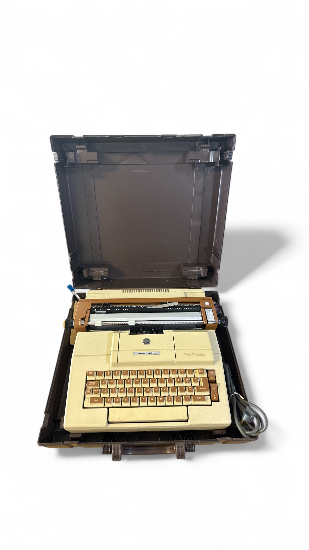 A Smith Corona Vantage Electric Portable Typewriter, likely from the late 20th century. The typewriter features a cream/tan textured plastic body with contrasting brown plastic keys and a standard English QWERTY keyboard. It is housed within its original dark brown plastic carrying case, which is presented open. The power cord is present and coiled, and a small blue brush-like accessory is tucked near the carriage.