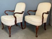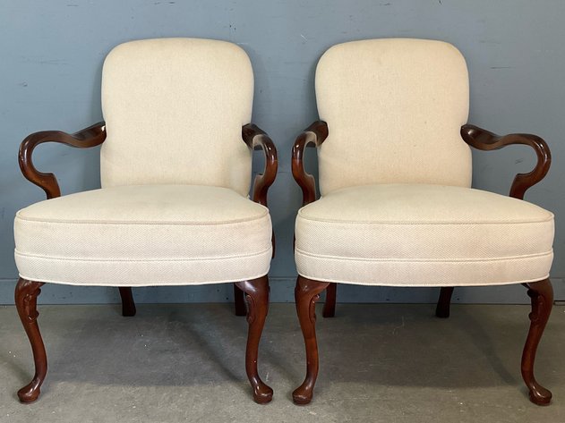 A pair of George II style armchairs, dating to the second quarter 20th century. Each chair features a dark-stained wooden frame, an arched upholstered back and seat, and exposed, gracefully curved wooden armrests. The chairs are supported by cabriole legs terminating in pad feet. They are upholstered in a light, textured woven fabric, possibly cream or off-white.