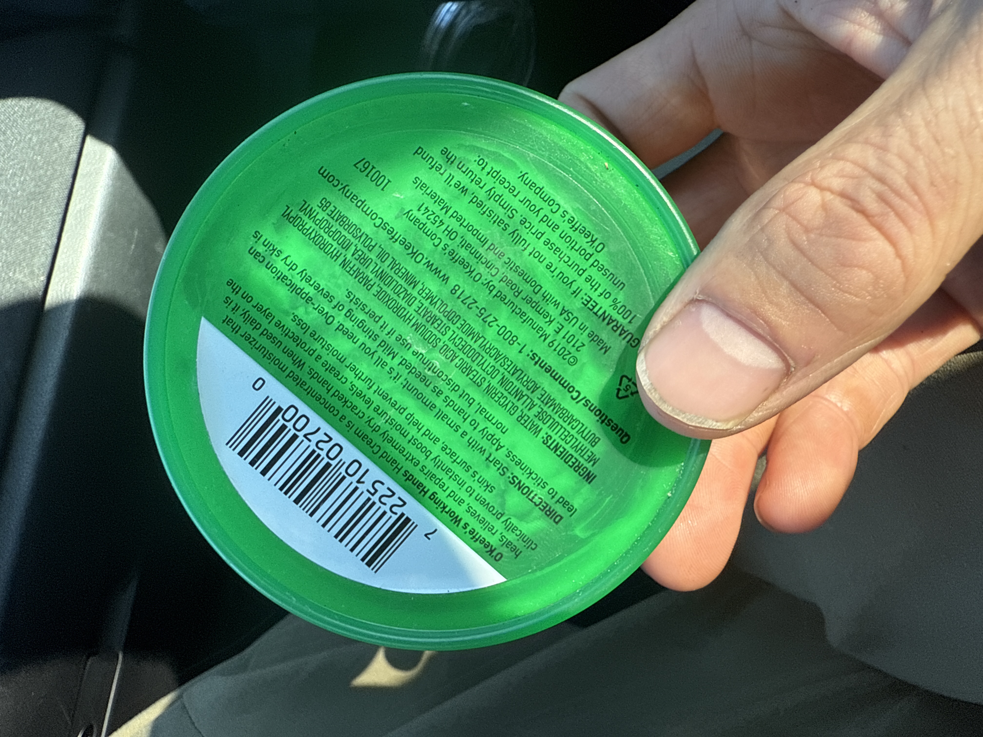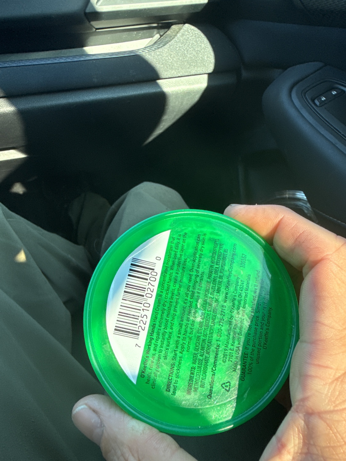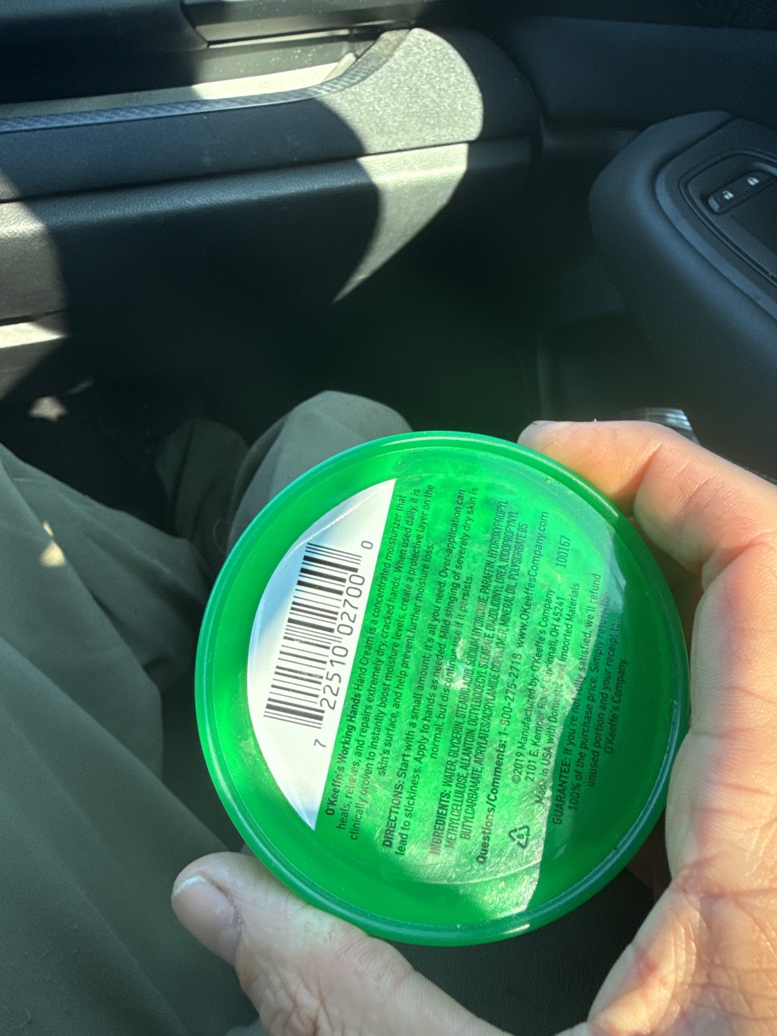 An O’Keeffe’s Working Hands Hand Cream container. This contemporary, round green plastic container features a bright green base and a lighter green screw-top lid. A prominent red oval logo displays ‘O’Keeffe’s,’ ‘WORKING HANDS CREAM,’ and the slogan ‘GUARANTEED RELIEF.’ The reverse side provides detailed product information, including ingredients, directions, manufacturer details (©2019, Made in USA), a satisfaction guarantee, a barcode (7 22510 02700 0), and a lot number (100167). The container holds a visible quantity of white, thick cream, with residue on the interior walls.