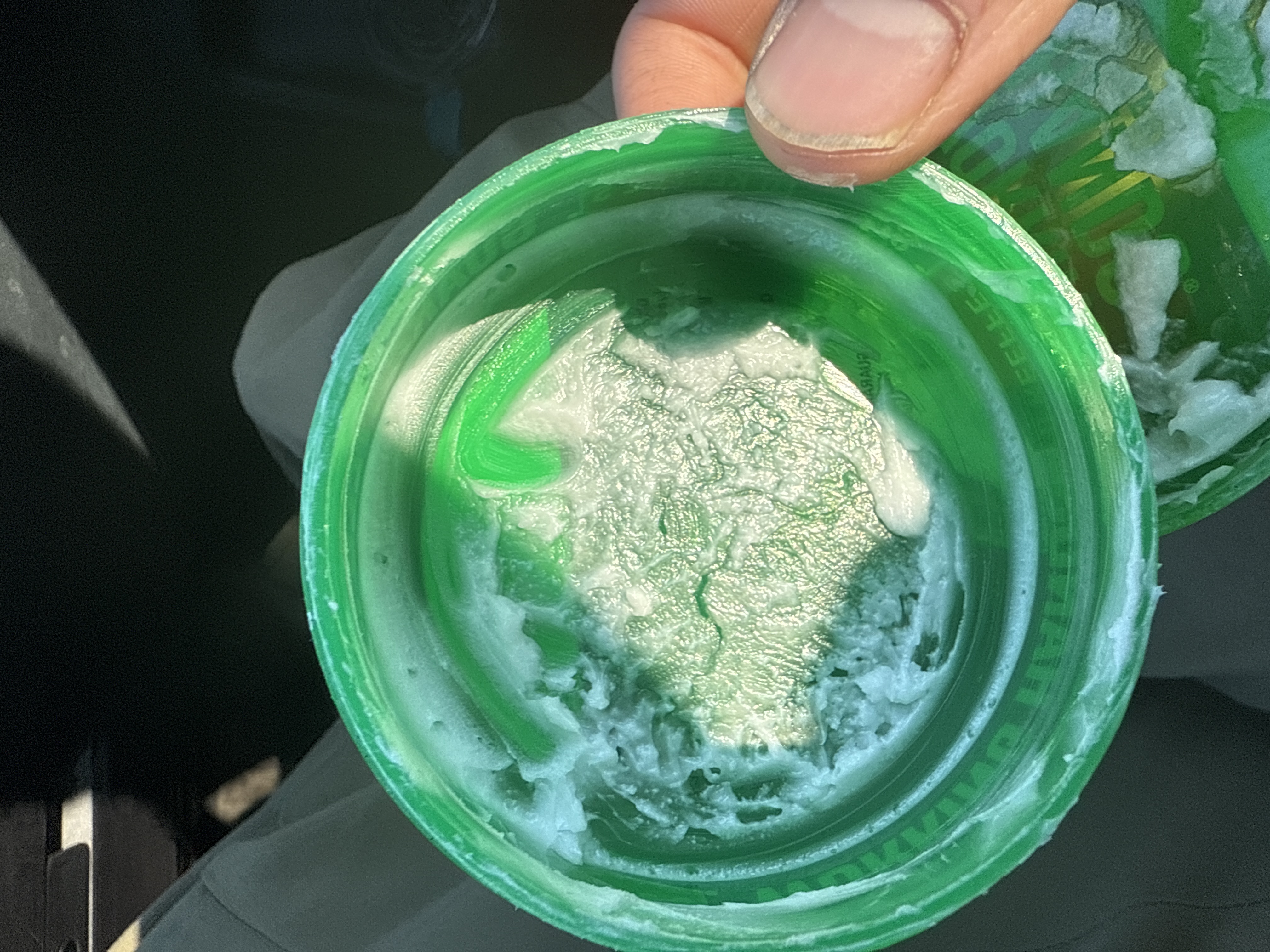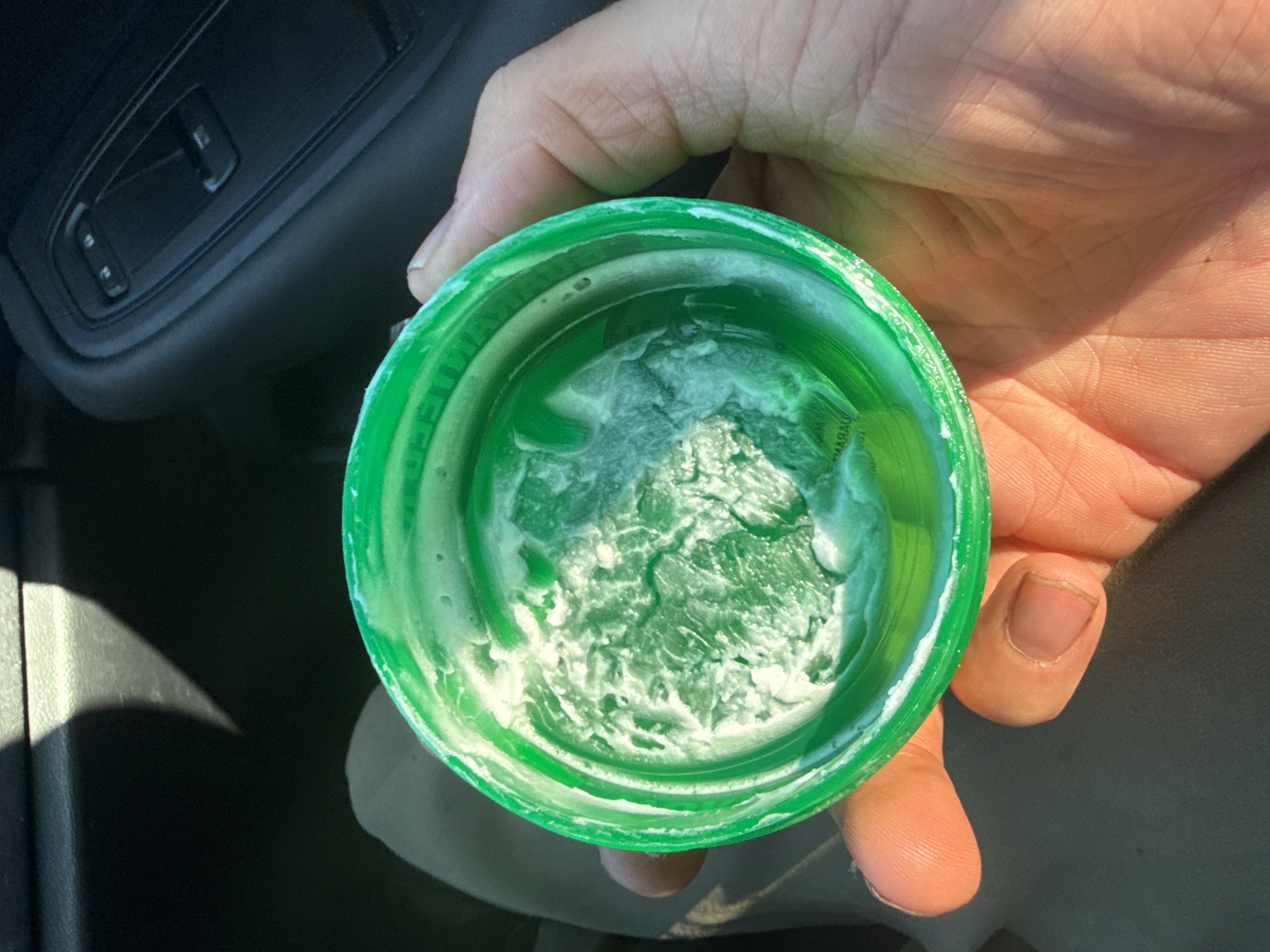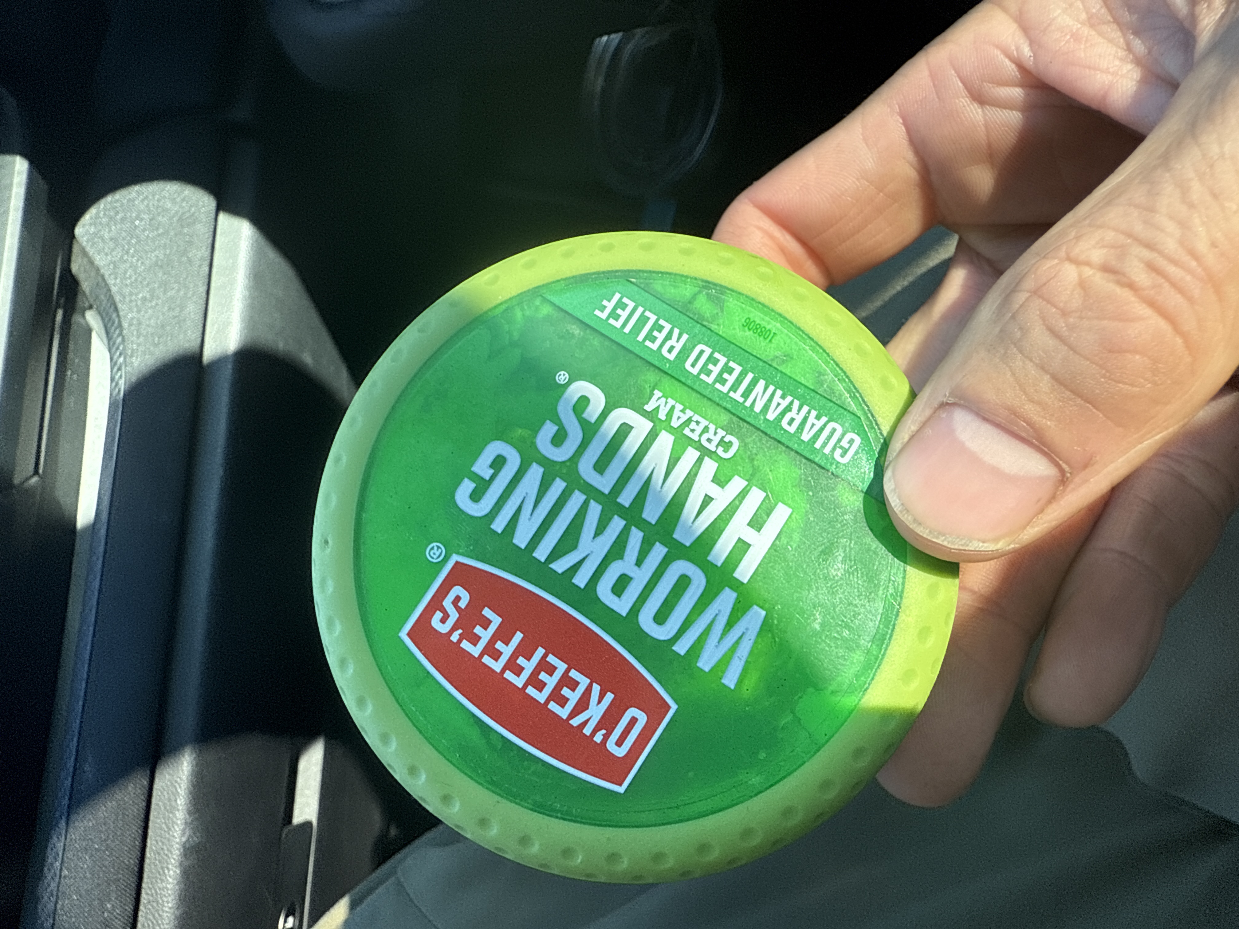 An O’Keeffe’s Working Hands Hand Cream container. This contemporary, round green plastic container features a bright green base and a lighter green screw-top lid. A prominent red oval logo displays ‘O’Keeffe’s,’ ‘WORKING HANDS CREAM,’ and the slogan ‘GUARANTEED RELIEF.’ The reverse side provides detailed product information, including ingredients, directions, manufacturer details (©2019, Made in USA), a satisfaction guarantee, a barcode (7 22510 02700 0), and a lot number (100167). The container holds a visible quantity of white, thick cream, with residue on the interior walls.