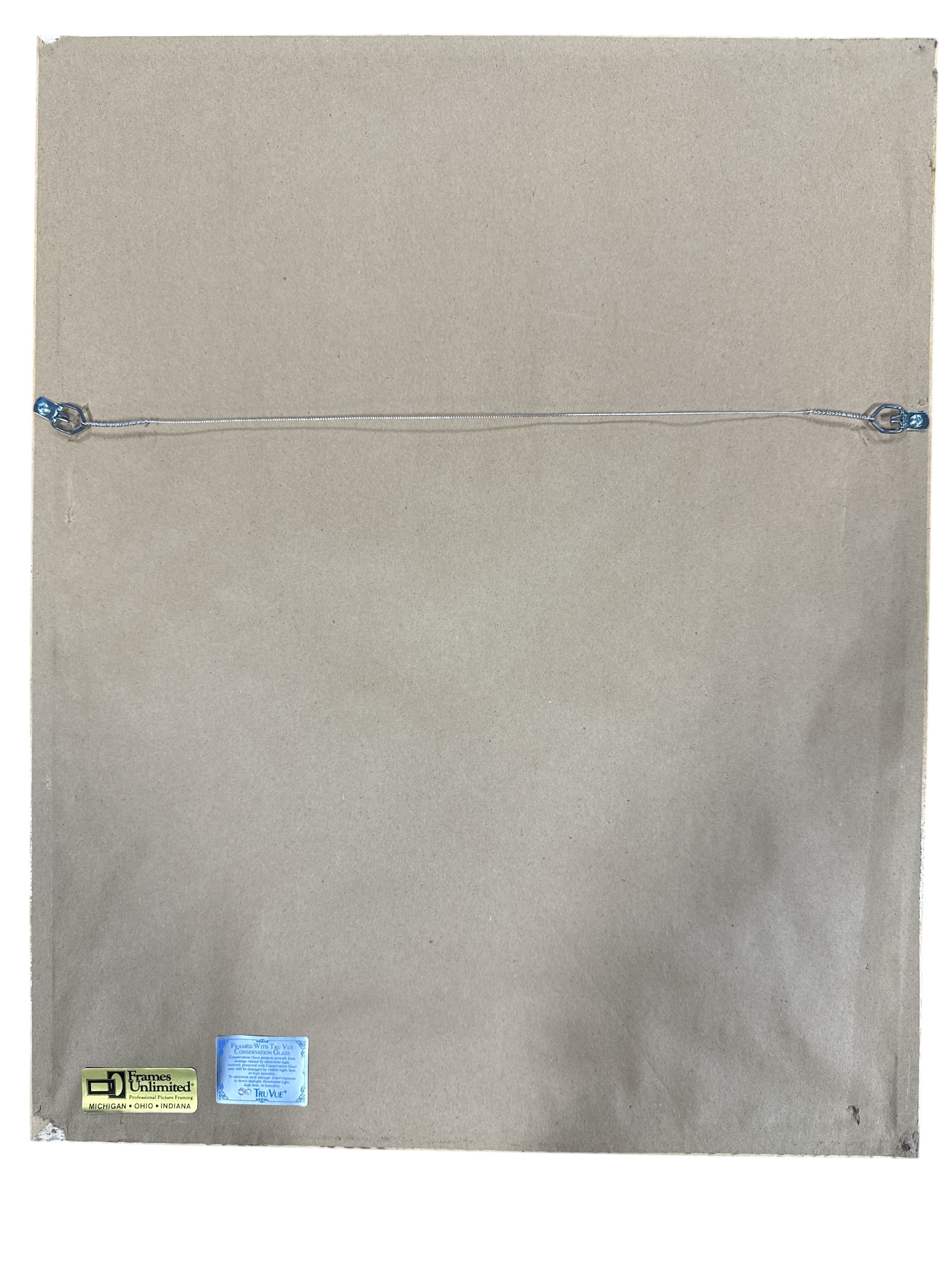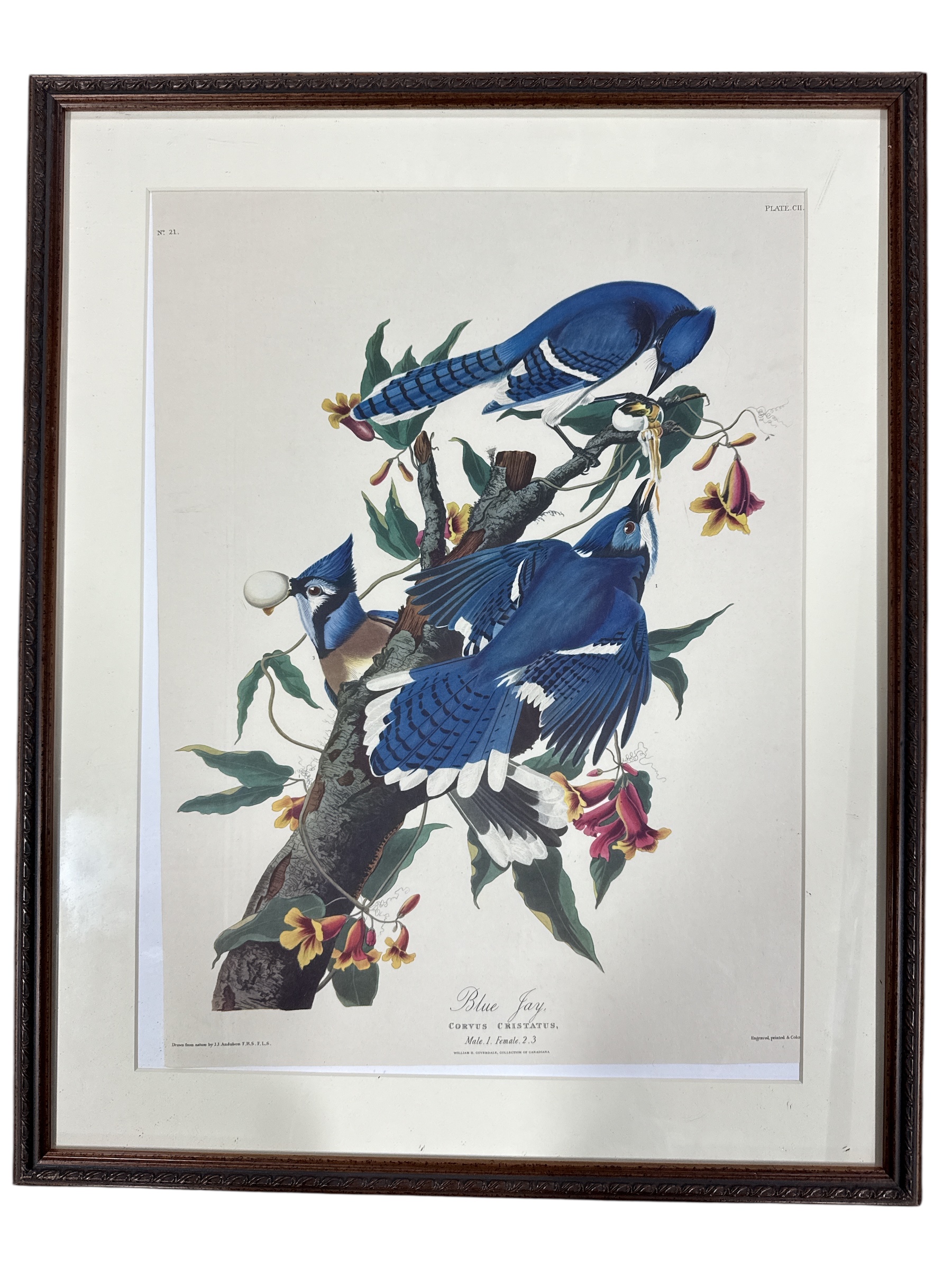 A framed print after John James Audubon’s ‘Blue Jay’ (Corvus Cristatus), Plate CIII, depicting three Blue Jays on a branch with flowering plants, presented in a natural history illustration style. The print is matted and housed under glass in a dark wood-toned frame featuring a molded decorative edge. Visible text on the print includes “NO. 21.” and “PLATE CIII.” at the top, and at the bottom, “Blue Jay / CORVUS CRISTATUS. / Male 1. Female 2. 3.” alongside an attribution to “Drawn from nature by J.J. Audubon F.R.S. F.L.S.” and “Engraved, printed & colored by R. Havell.” The reverse side reveals a cardboard backing with a “Frames Unlimited!” sticker and a “Tru Vue” sticker, with a hanging wire attached, indicating modern framing.