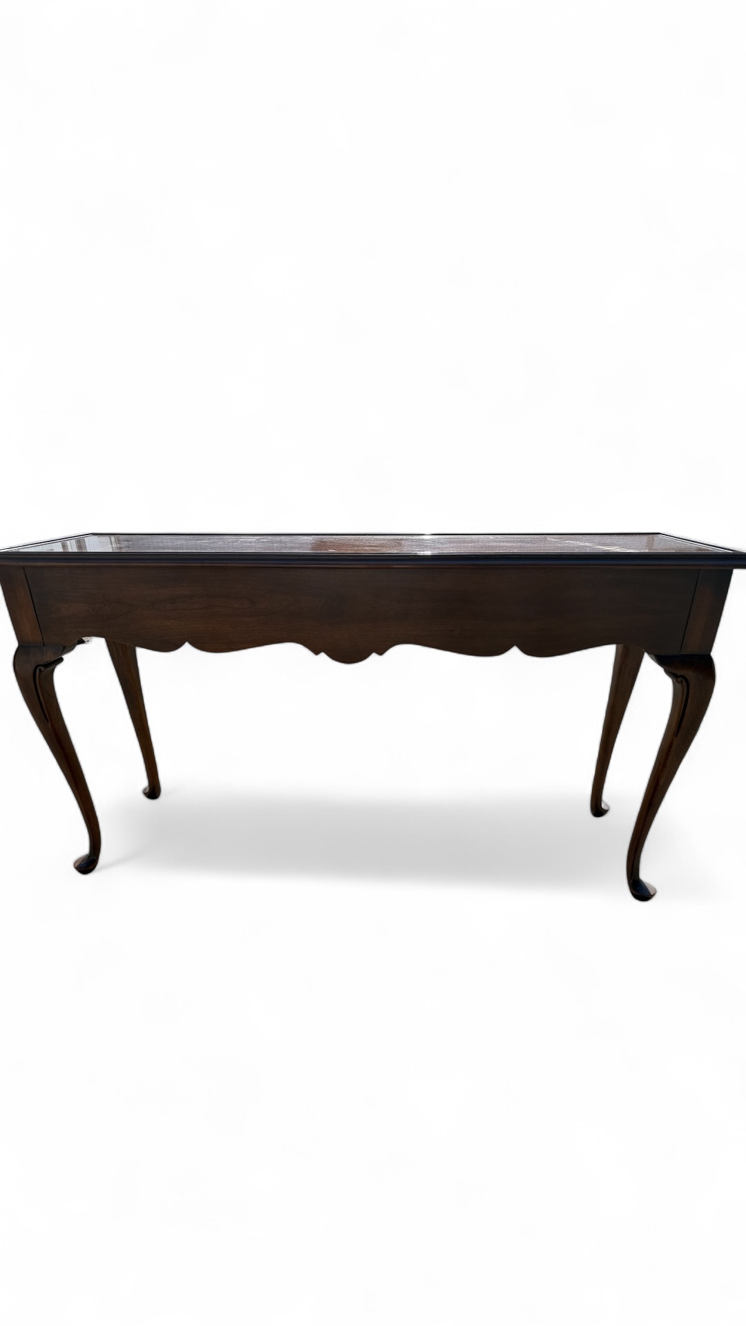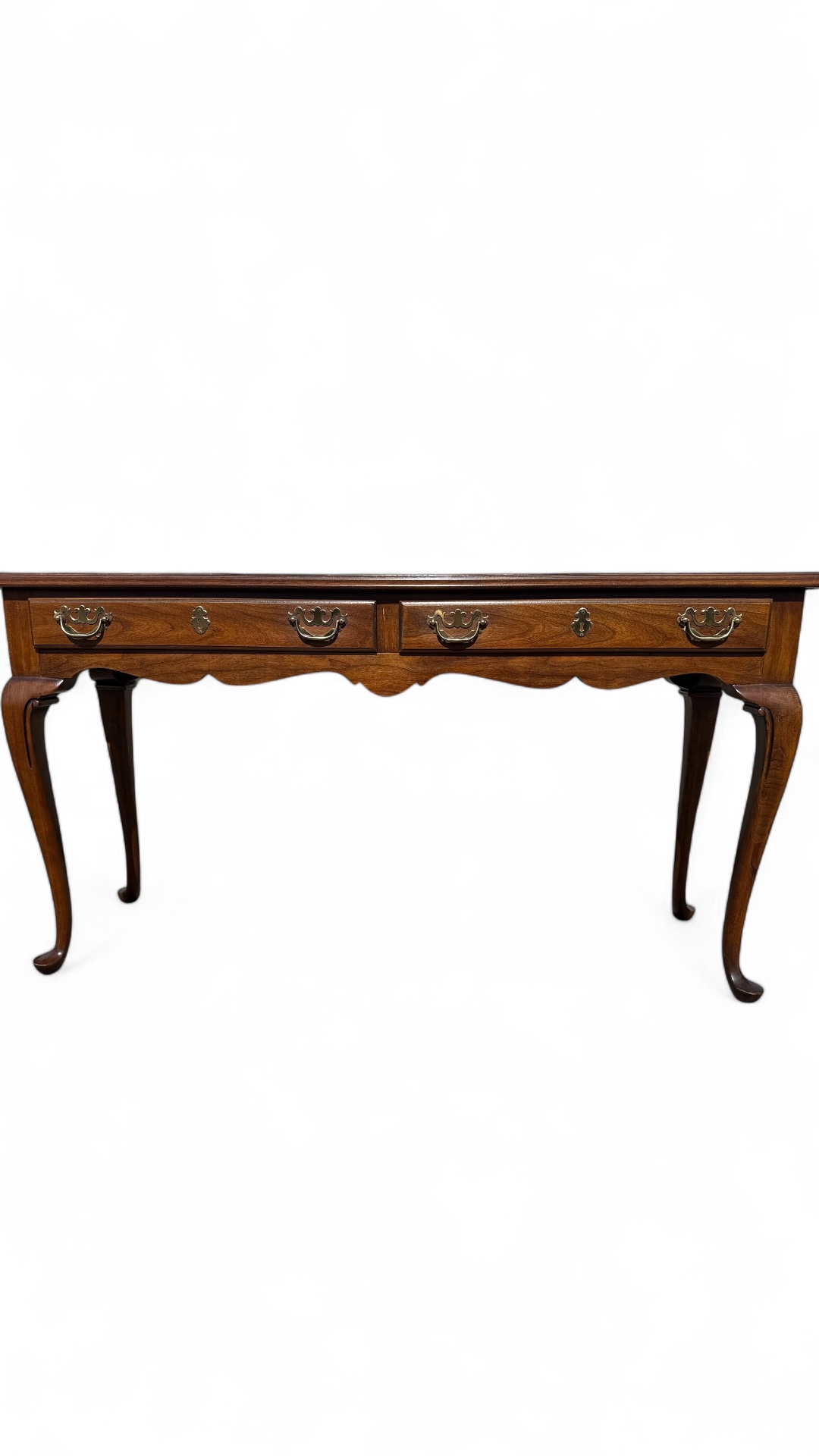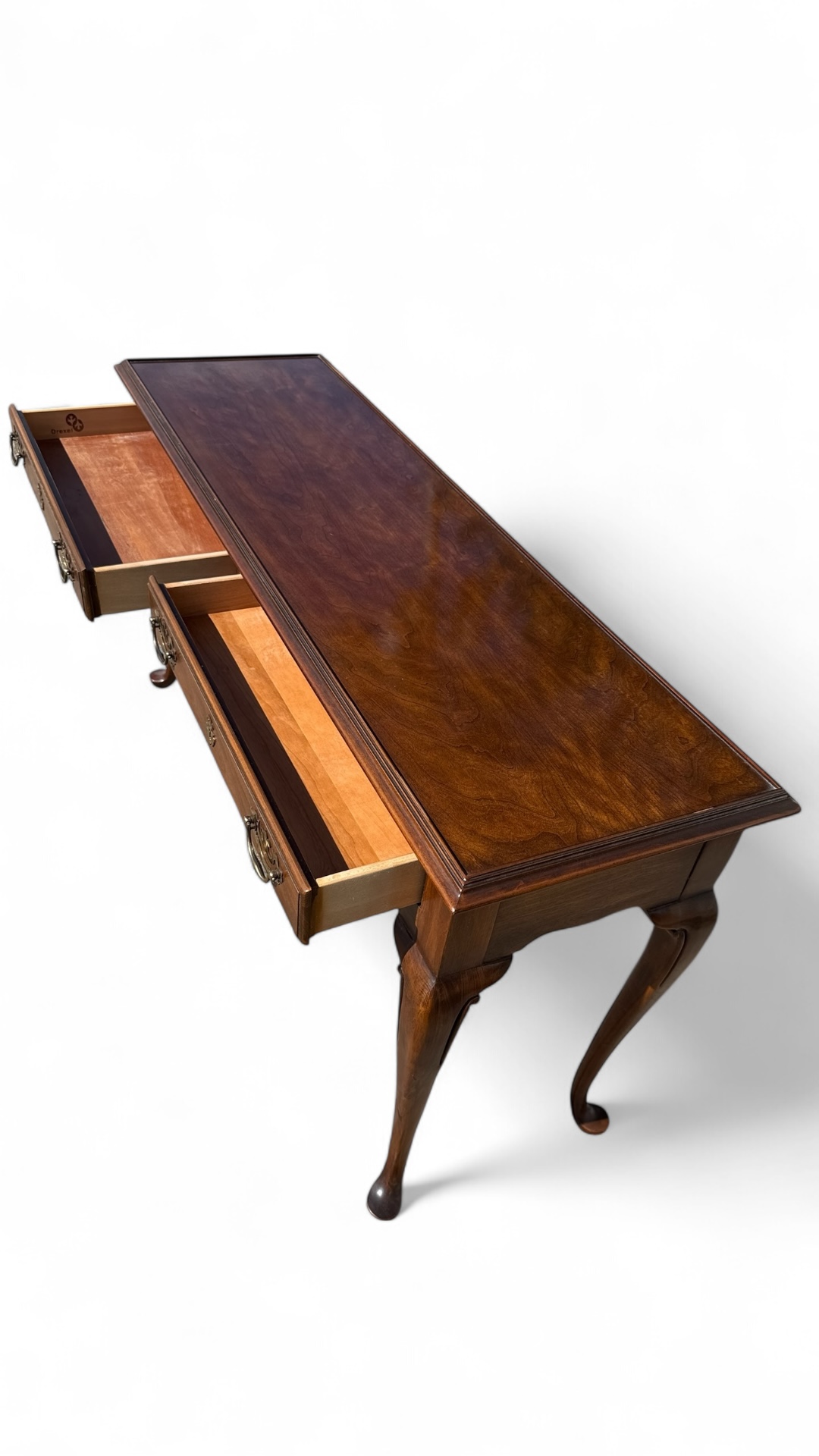 A Drexel Chatham Oaks Collection Chippendale style dark reddish-brown wooden console table, 86x18x29h., featuring four cabriole legs and four drawers, each with two brass-colored pull handles and a key escutcheon.