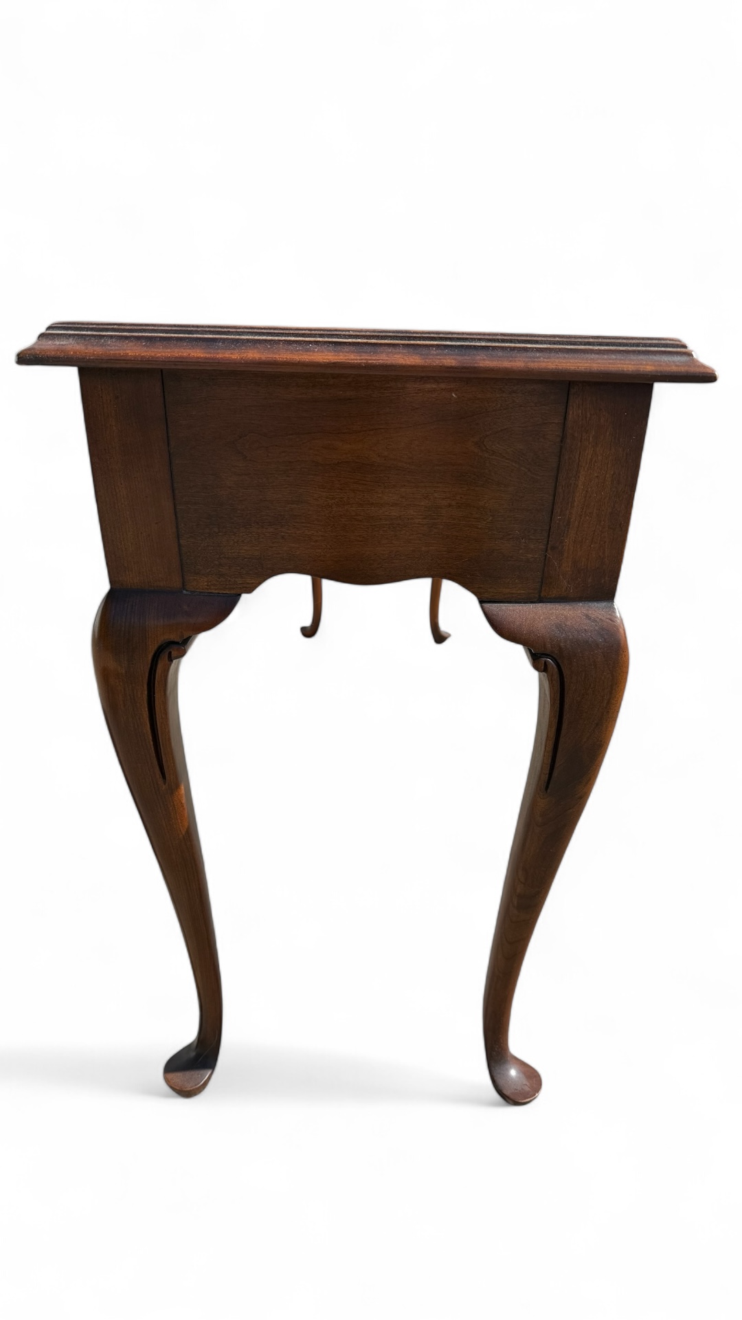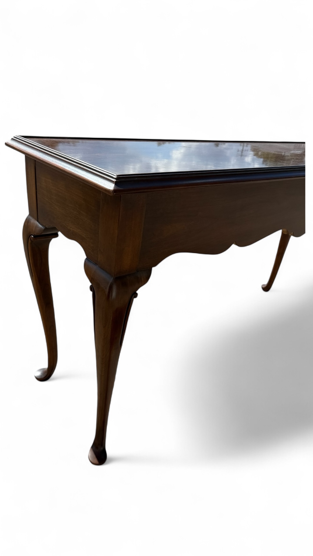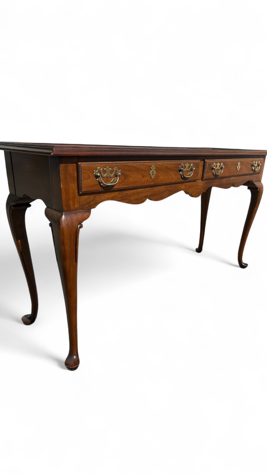 A Drexel Chatham Oaks Collection Chippendale style dark reddish-brown wooden console table, 86x18x29h., featuring four cabriole legs and four drawers, each with two brass-colored pull handles and a key escutcheon.