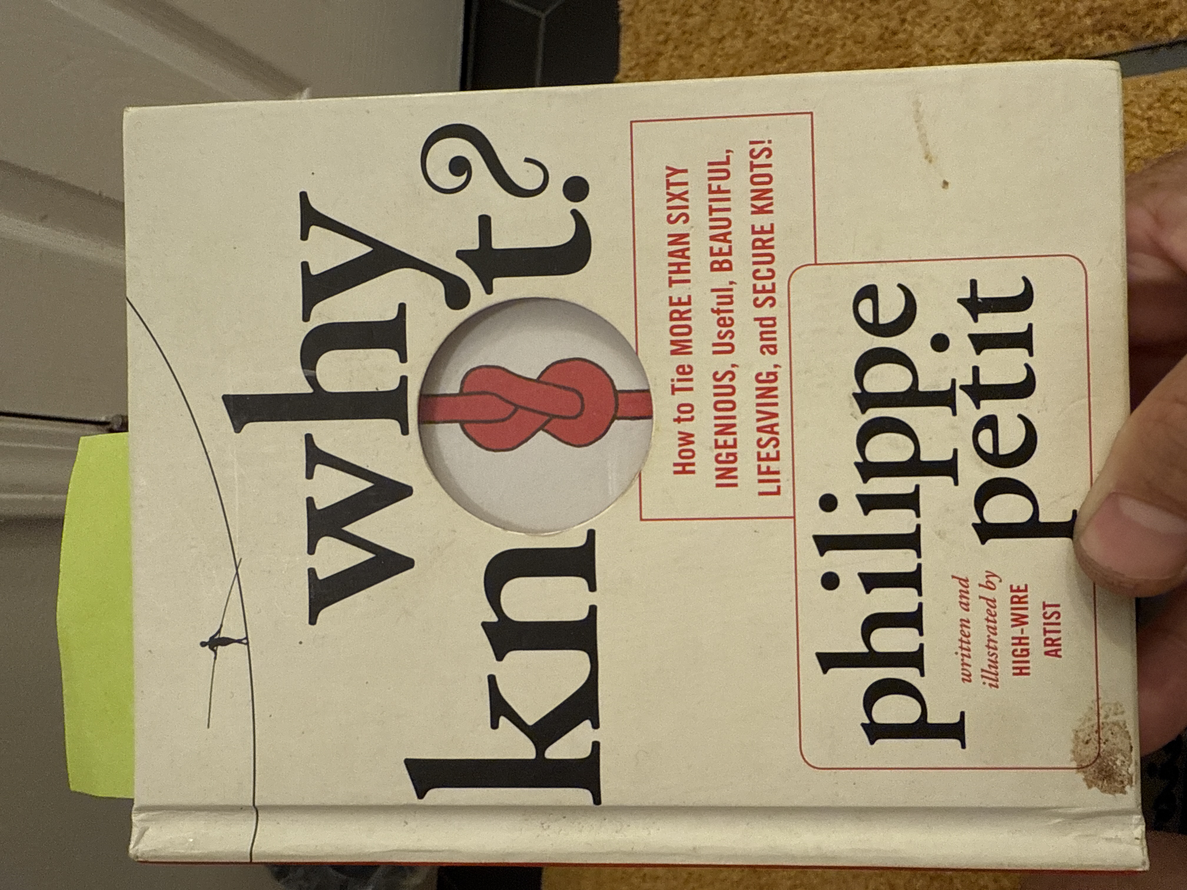 A cream-colored hardcover book titled ‘Why Knot?’ by Philippe Petit, featuring a red knot illustration, with ISBN 978-1-4197-0676-9 and published by Abrams Image.