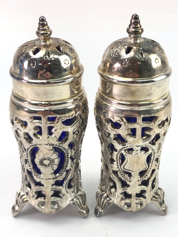 Two ornate silver-colored metal shakers with blue glass inserts, featuring intricate pierced designs and a central crest or floral motif on each.