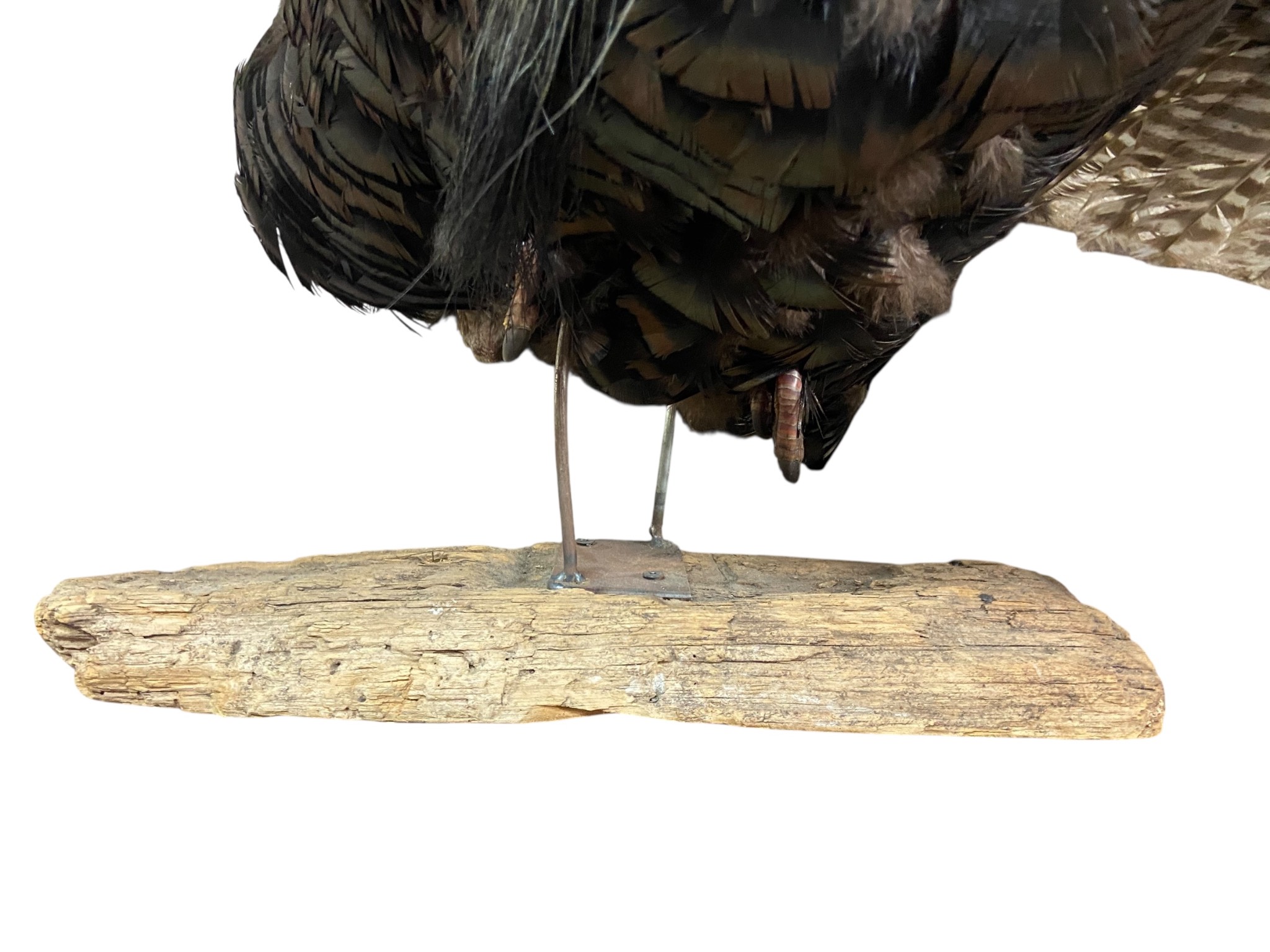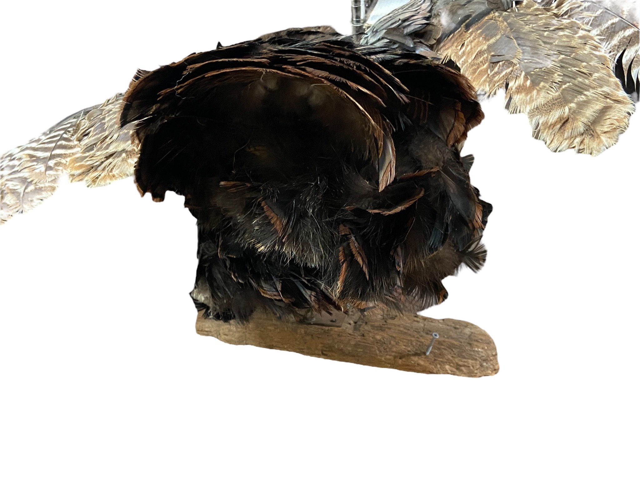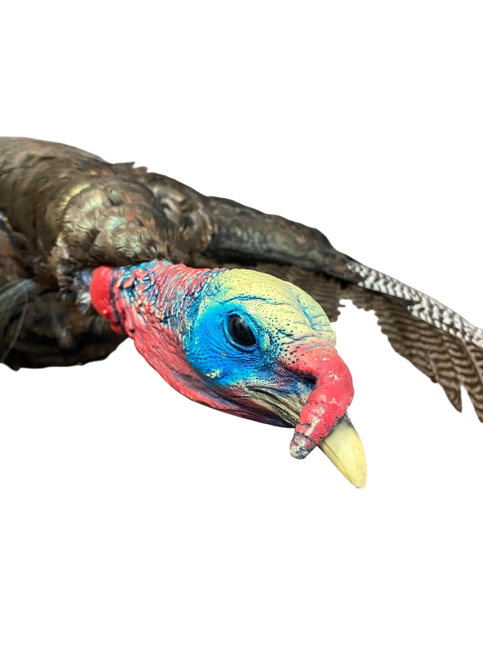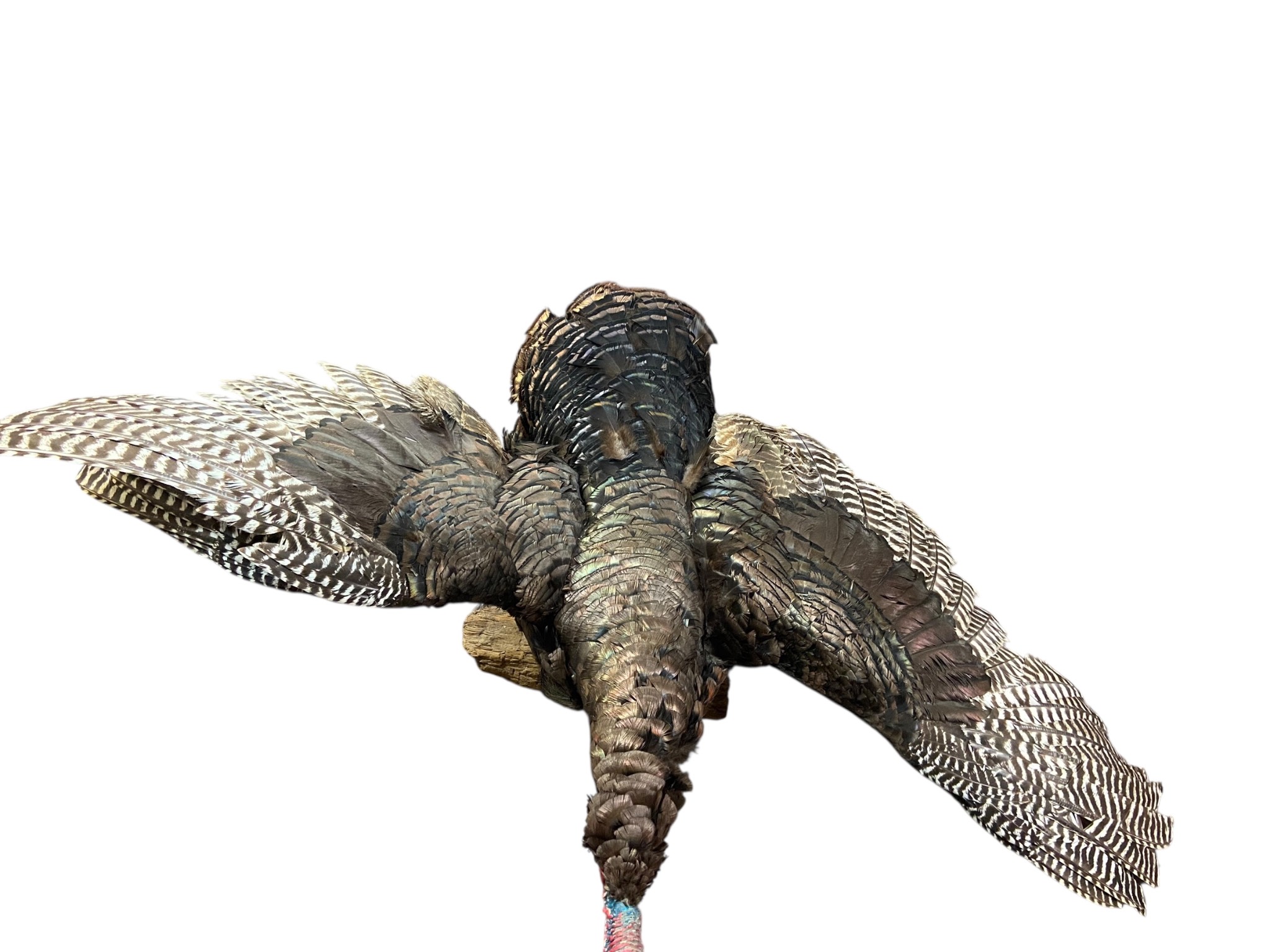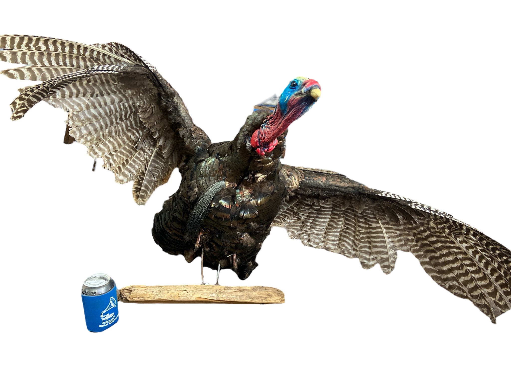 A full-body taxidermy mount of a wild turkey, posed dynamically with its wings fully outstretched and head slightly lowered. The specimen features natural dark, iridescent plumage on its body, with banded brown and cream feathers on its wings and tail. Its head and neck display striking artificial coloration in shades of red, blue, and yellow, characteristic of a wild turkey’s head during display. The bird is securely mounted on a rustic, natural piece of driftwood, utilizing visible metal supports for the feet.