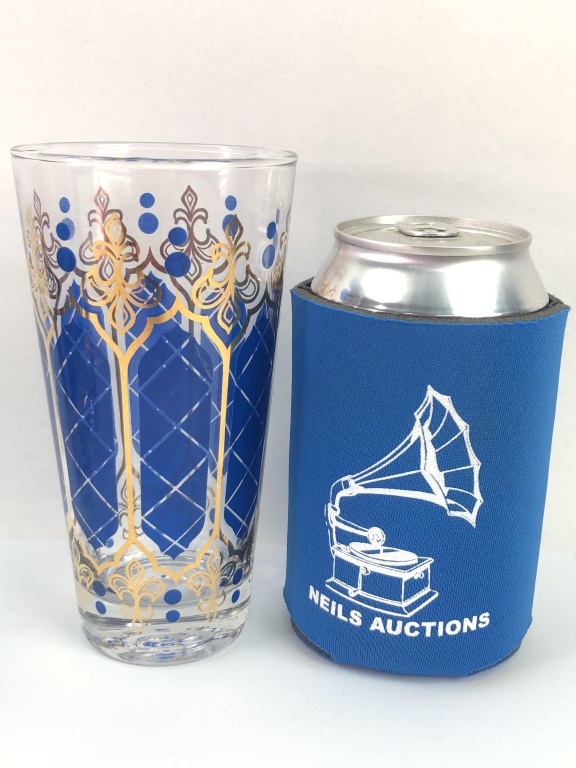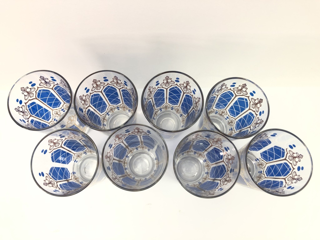 (8) Anchor Hocking Mid-Century Modern tumblers featuring a royal blue and gold fleur-de-lis design. Each tumbler measures 5 3/4 inches tall. Elegant addition for collectors or table decor.